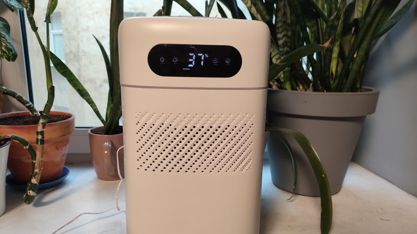 С помощью дисплея можно в любой момент считать показания встроенного гигрометра, а для управления устройством могут использоваться как сенсорные кнопки, так и мобильное приложение.
