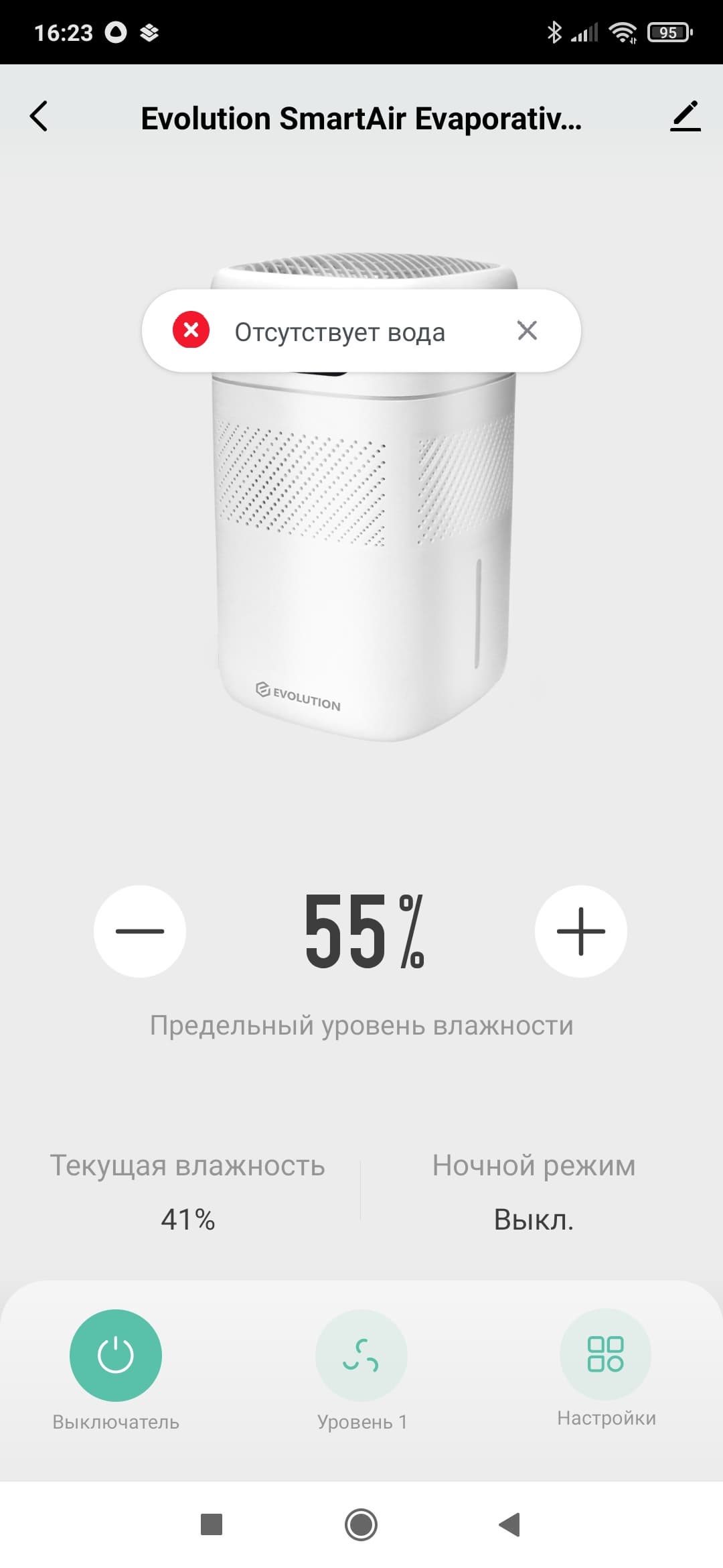 На главном экране отображается текущий уровень влажности в помещении. Тут же выводятся сообщения об ошибках (если таковые были обнаружены).
