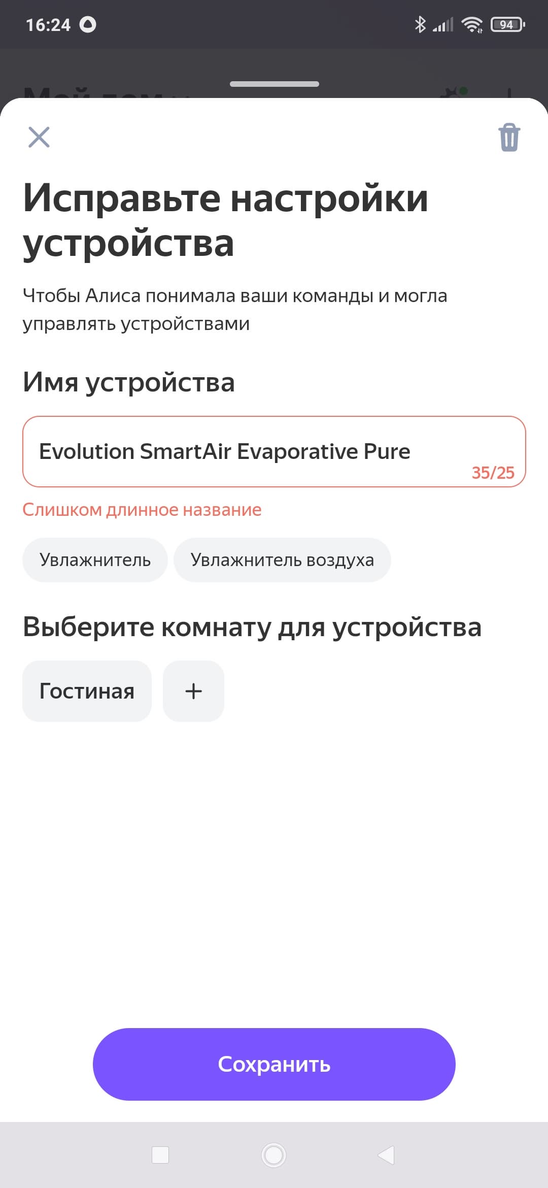 Процесс добавления оказался стандартен — придумываем название для устройства, выбираем комнату, в которой он установлен, и готово.