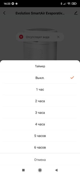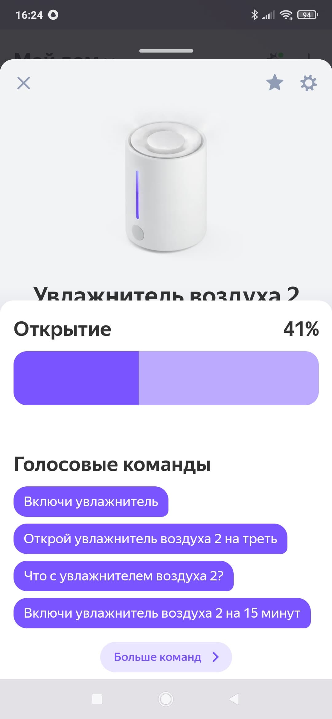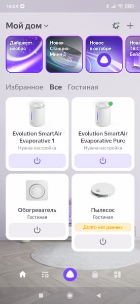 Как это часто бывает, голосовое управление через Алису оказалось реализовано плохо: на главной странице мы можем только включить и выключить прибор, а также поиграть с бесполезным (неработающим) бегунком, отвечающим за «Открытие» увлажнителя.