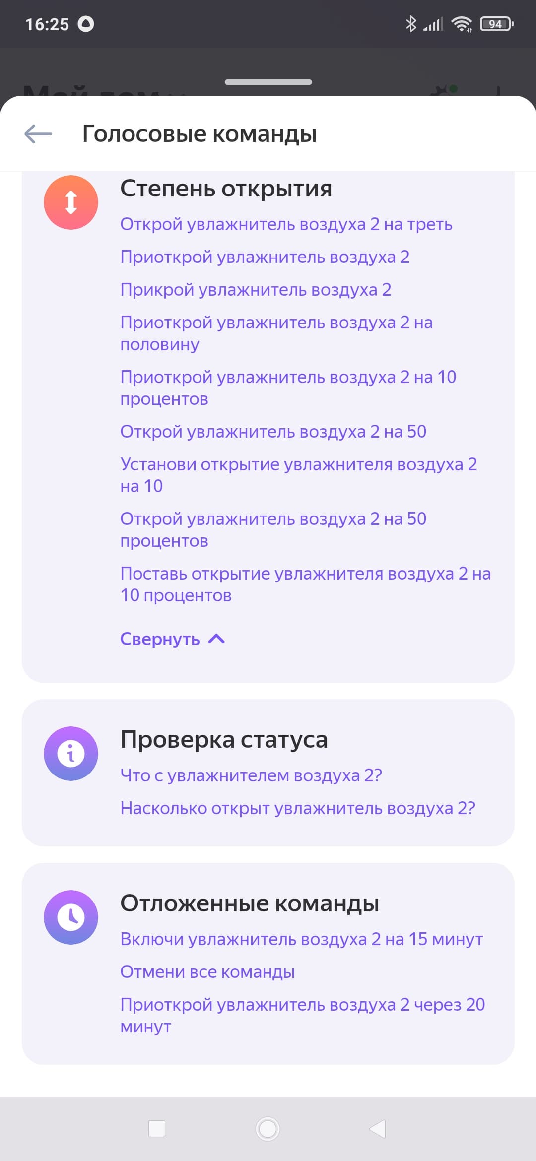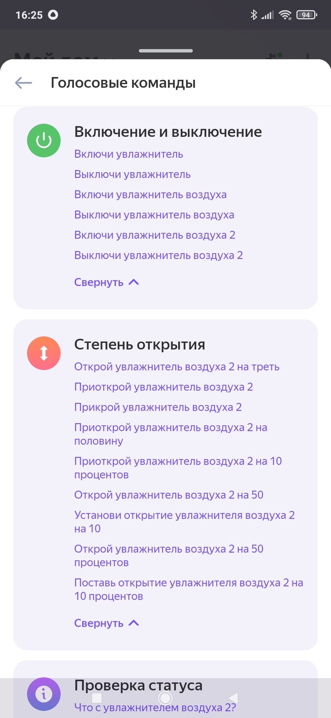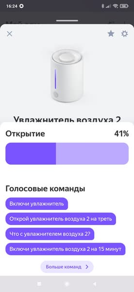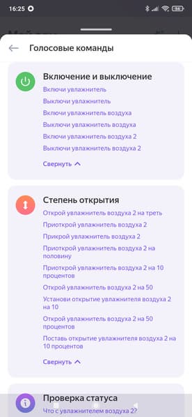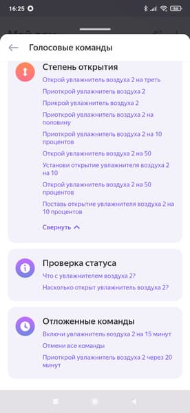 В голосовых командах также всё оказалось не очень: раздел «степень открытия» нерабочий и бесполезный, да и команд для изменения режимов работы не нашлось...
