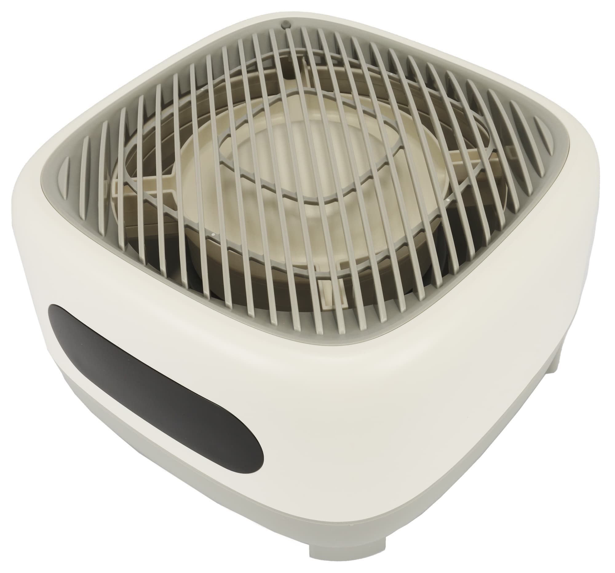 При доливе вода будет стекать по одному желобу (может показаться, что их четыре, но рабочий только один) и попадать в бак. Внутри виднеется вентилятор диаметром около 12 см.