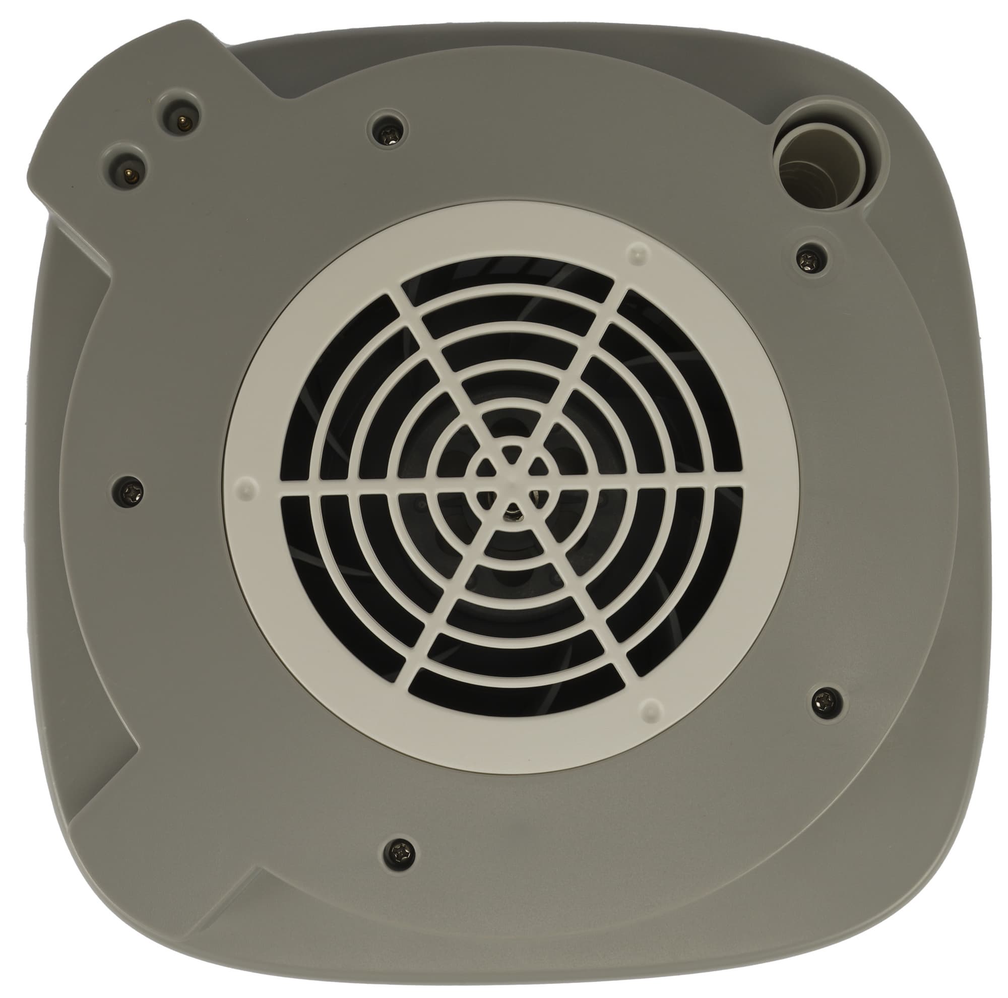 Если взглянуть на основной блок сверху, то мы увидим пластиковую решетку, под которой прячется защитный «грибок», защищающий вентилятор и внутренности устройства от попадания воды во время долива.