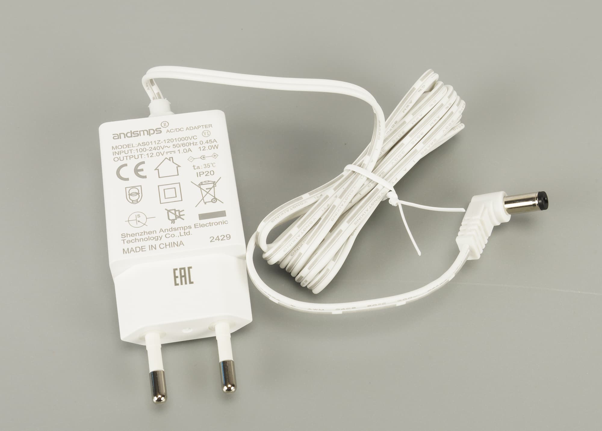Адаптер питания выдает ток 12 В 1 А. Мощность — 12 Вт, что в два раза превышает заявленную мощность самого увлажнителя (6 Вт).