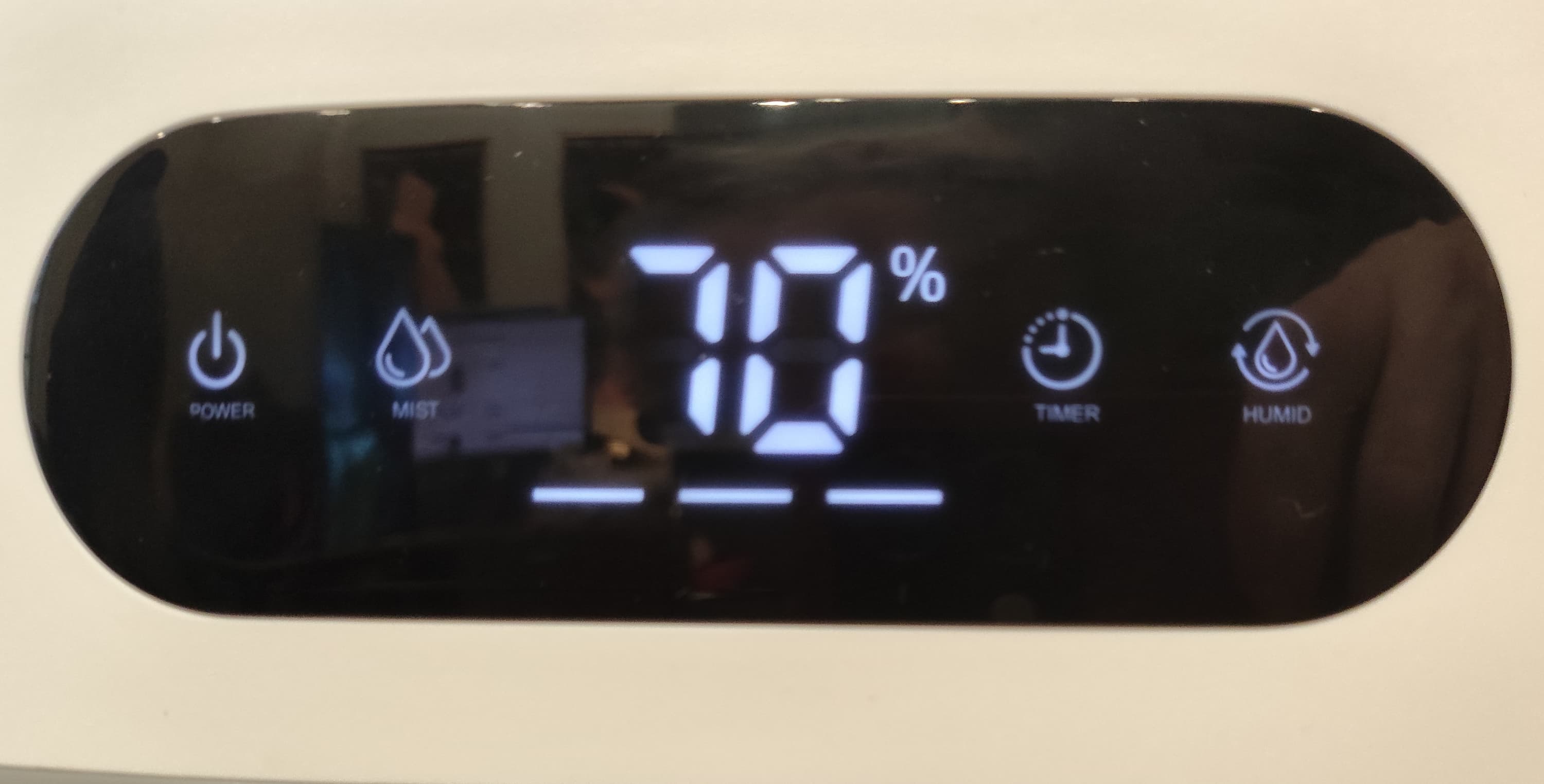 Показания дисплея также понятны: большие цифры по центру показывают текущий уровень влажности/целевой уровень (установленный пользователем). Одна, две или три полоски внизу обозначают выбранный режим мощности.