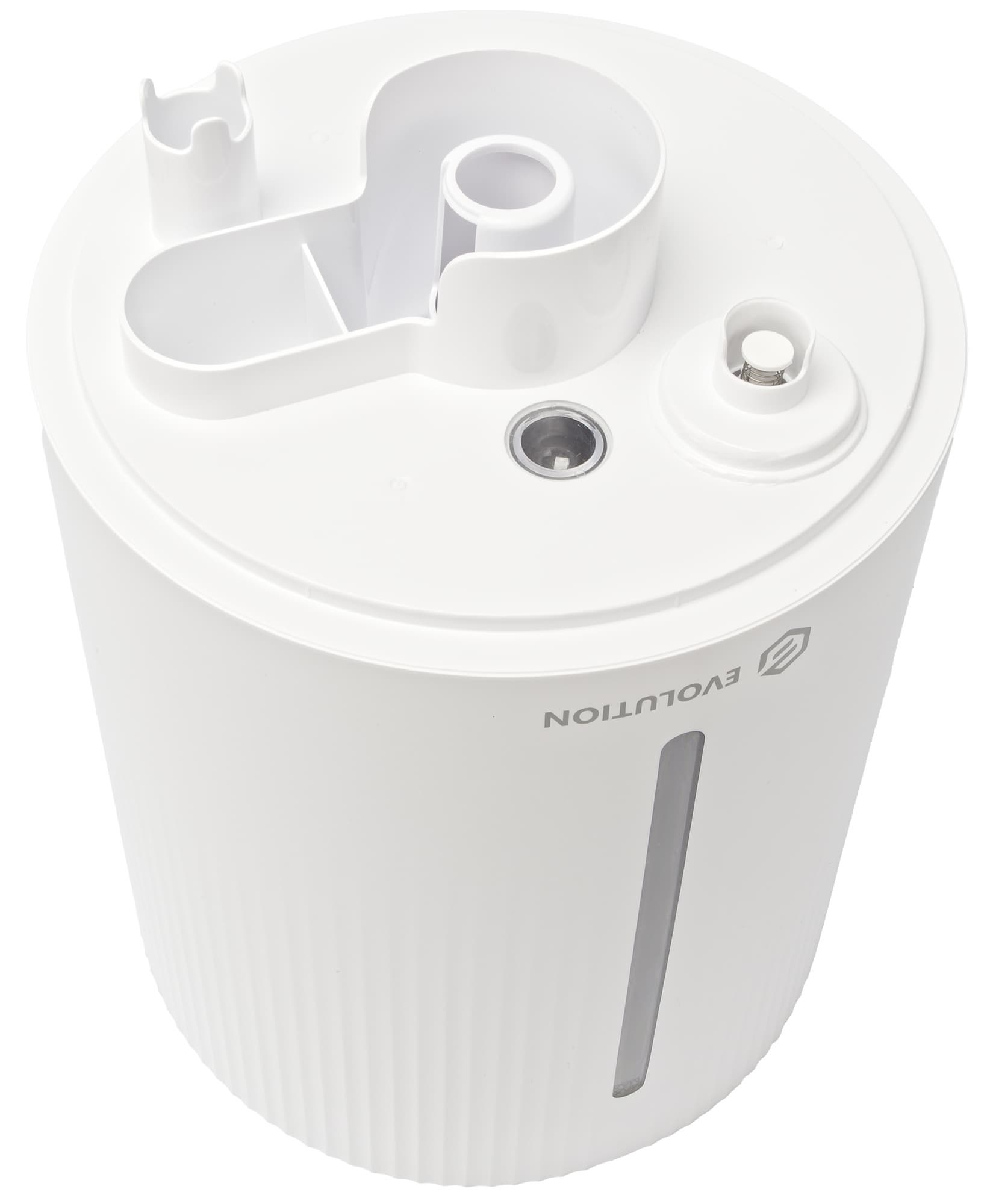 Корпус увлажнителя сделан из белого матового пластика. Выглядит он приятно: и качество литья, и качество сборки у прибора вполне достойное. На лицевой стороне бака находится вертикальная вставка из прозрачного материала, которая позволяет следить за уровнем воды, и логотип Evolution. Ниже, на лицевой стороне основания, имеется табло со светодиодной индикацией и сенсорные кнопки.