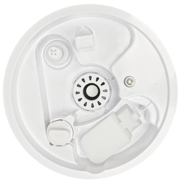 Если посмотреть на бак снизу, на нем видны основание трубки, крышка лампы подсветки из прозрачного пластика (на переднем плане) и клапан подачи воды в основание увлажнителя.