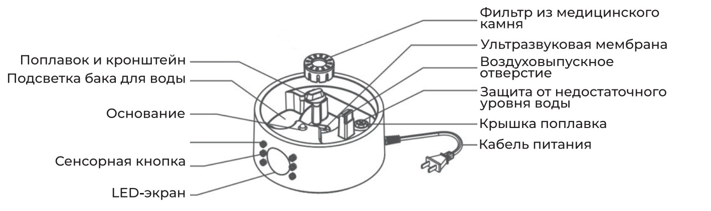 Принцип действия увлажнителя основан на образовании водного тумана на мембране под действием ультразвука. Вода с помощью поплавка дозированно подается на мембрану из резервуара.