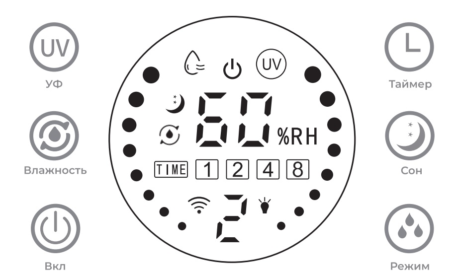 Панель управления увлажнителя включает два столбца сенсорных кнопок с белыми светодиодными индикаторами и светодиодное табло между ними. На табло отображается текущий выбранный режим и информация о влажности в помещении.