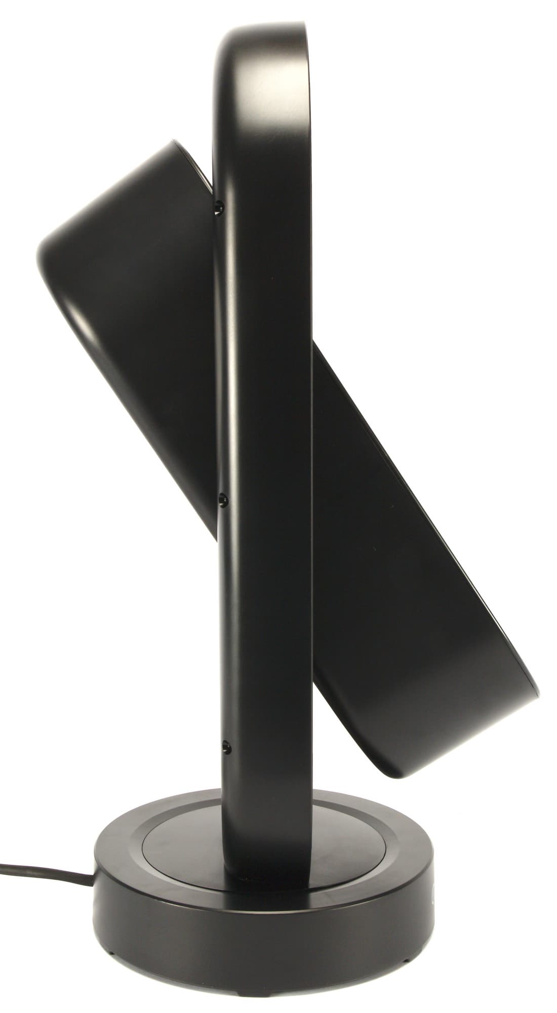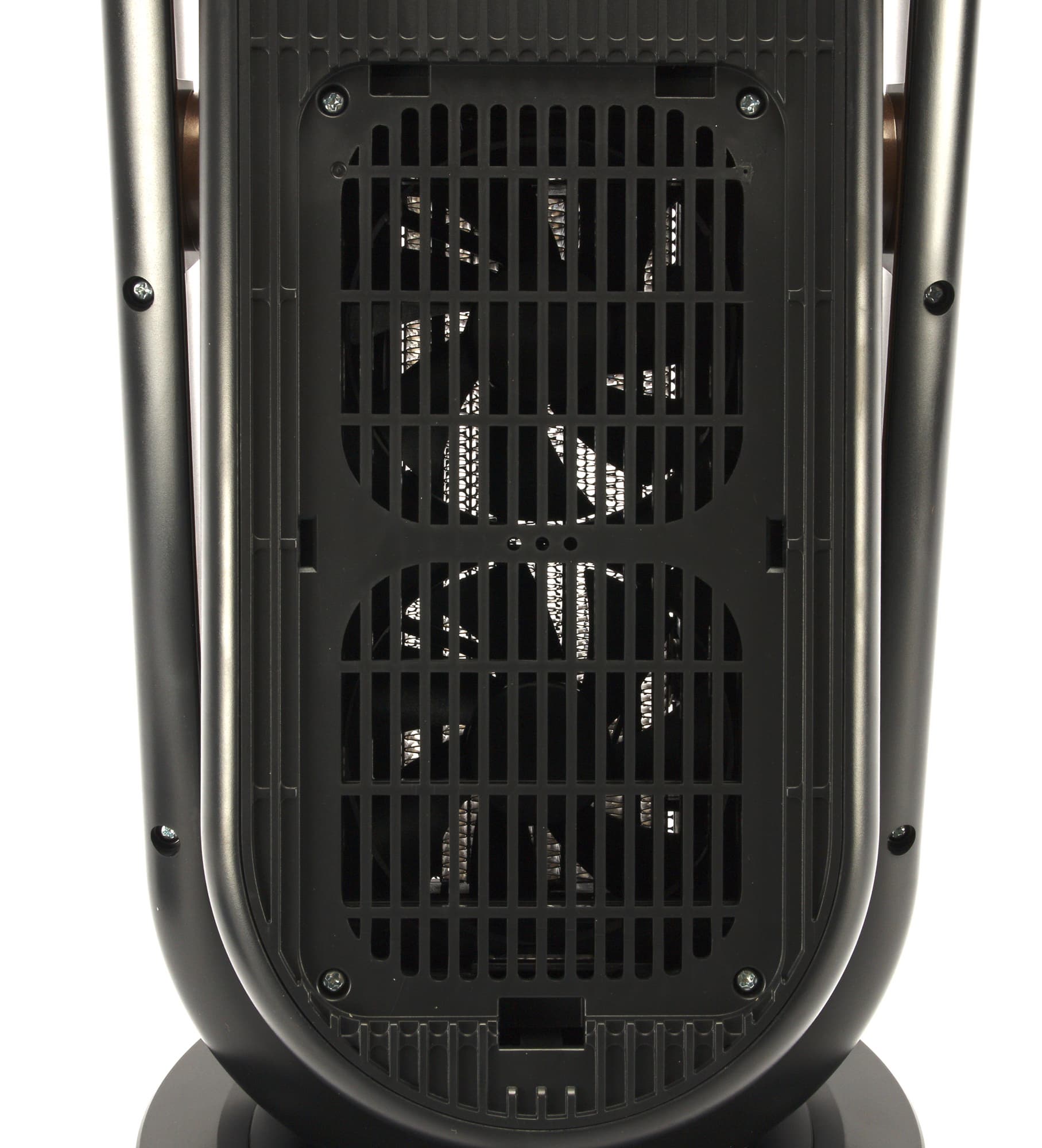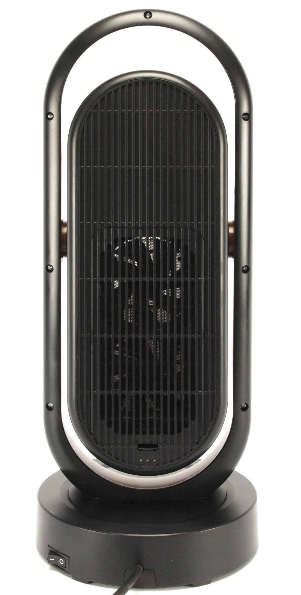 Тепловентилятор имеет обтекаемую форму без выраженных углов. И подставка, и корпус, и рамка, на которой он закреплен — все они круглые, либо имеют форму суперэллипса (то есть, выглядят как прямоугольник со скругленными углами). Давайте рассмотрим прибор поближе.