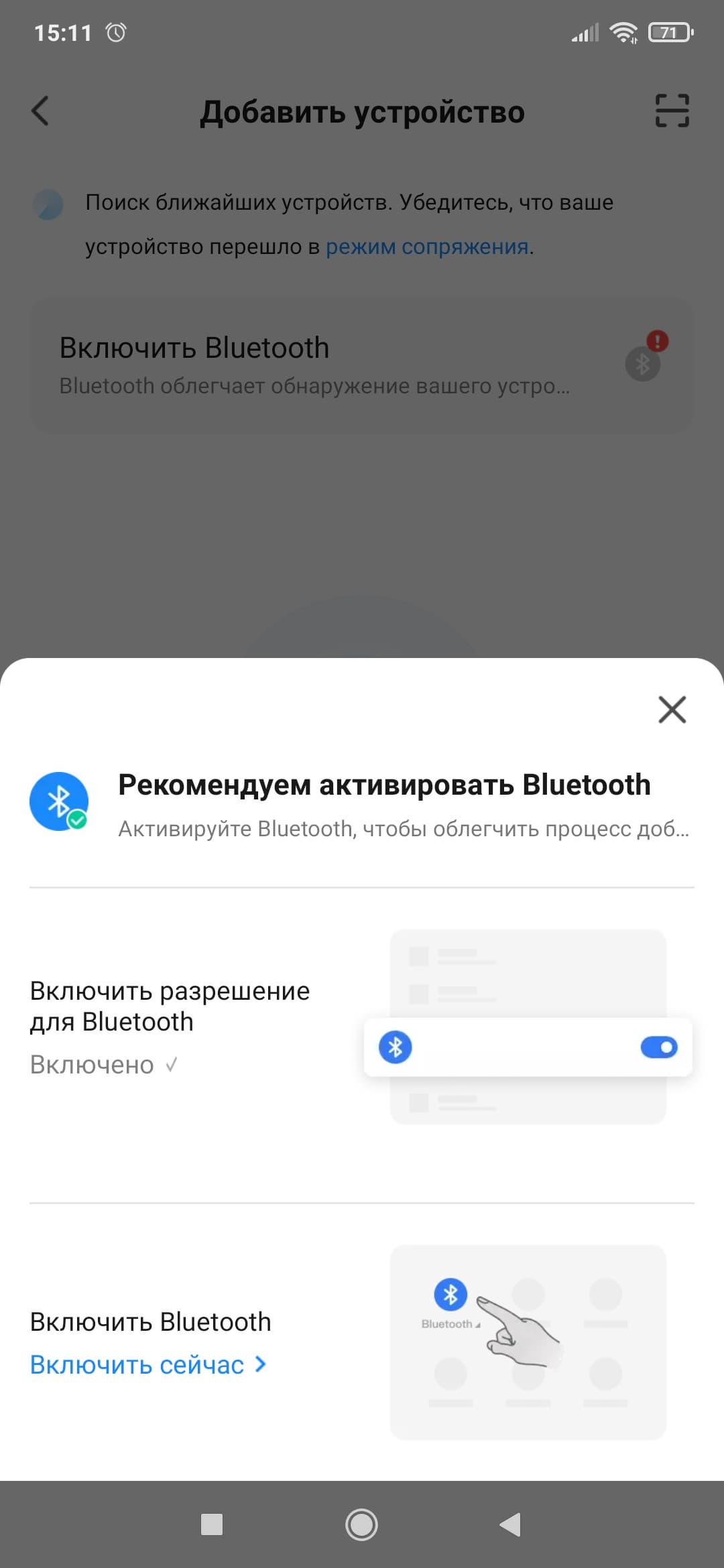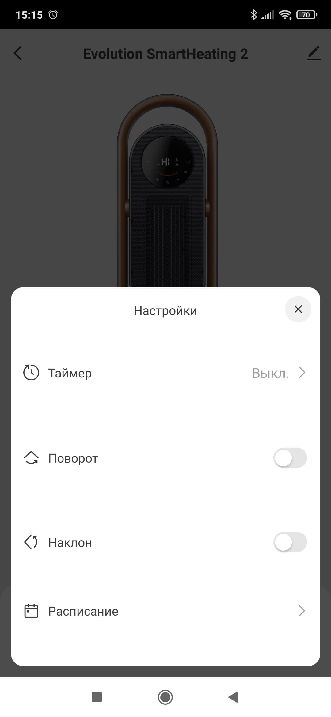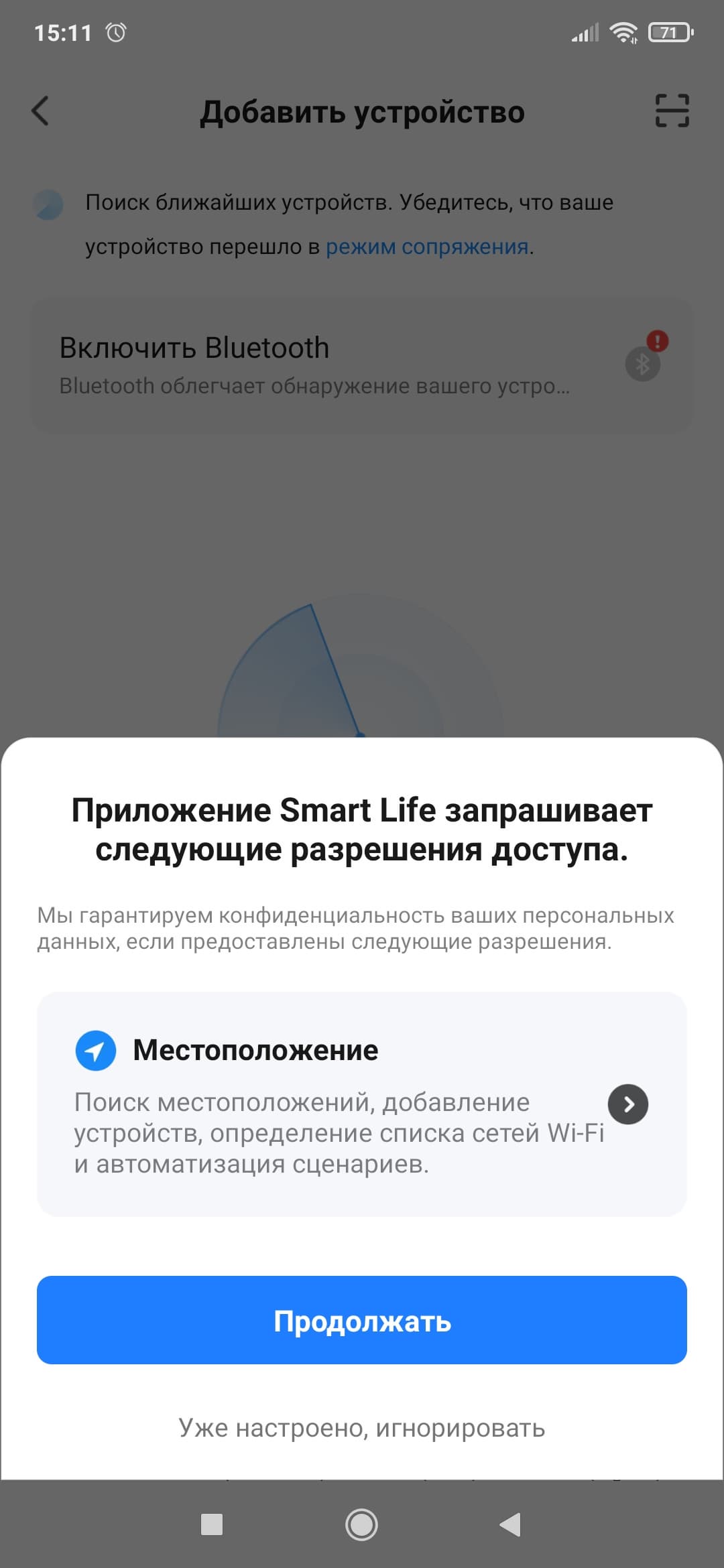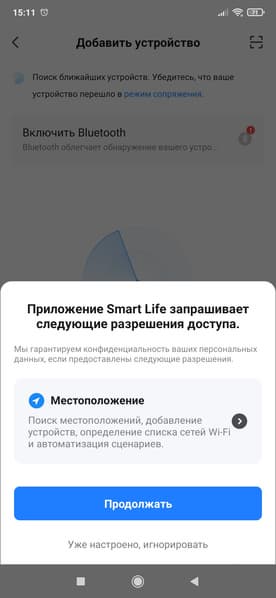 После завершения регистрации нужно будет предоставить необходимые разрешения, в том числе активировать Bluetooth для соединения с устройством и включить геолокацию. После этого можно включить на обогревателе режим сопряжения и обнаружить его в окне приложения.
