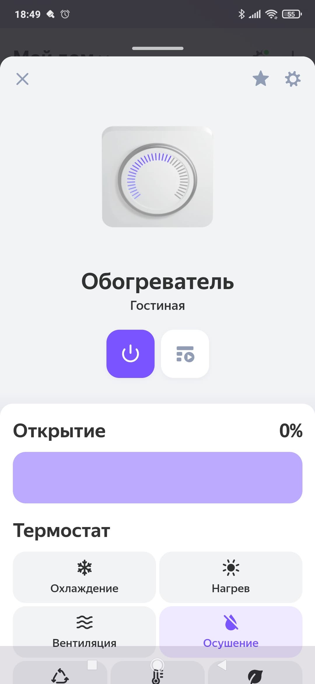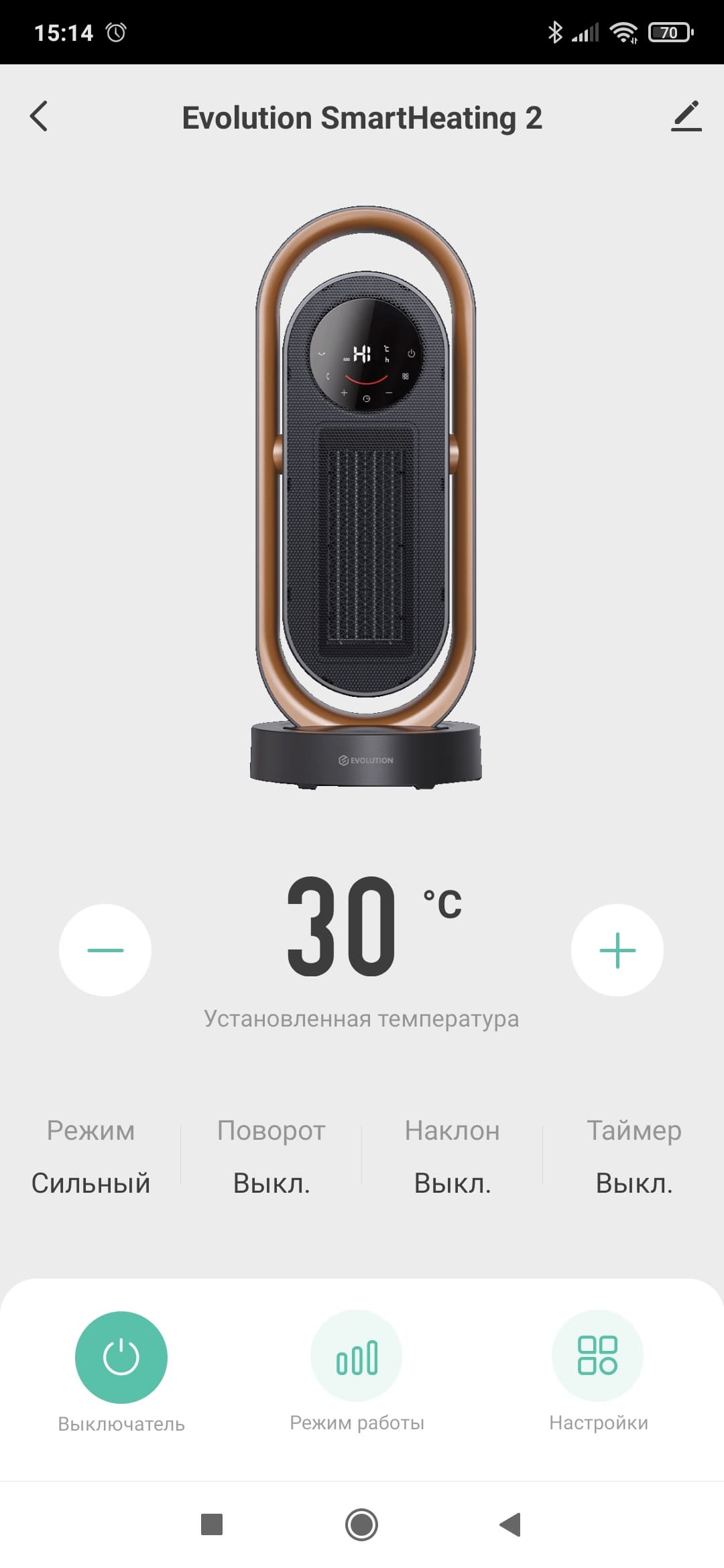 На главной странице мы можем включить и выключить устройство, выбрать режим работы или перейти в раздел настроек.