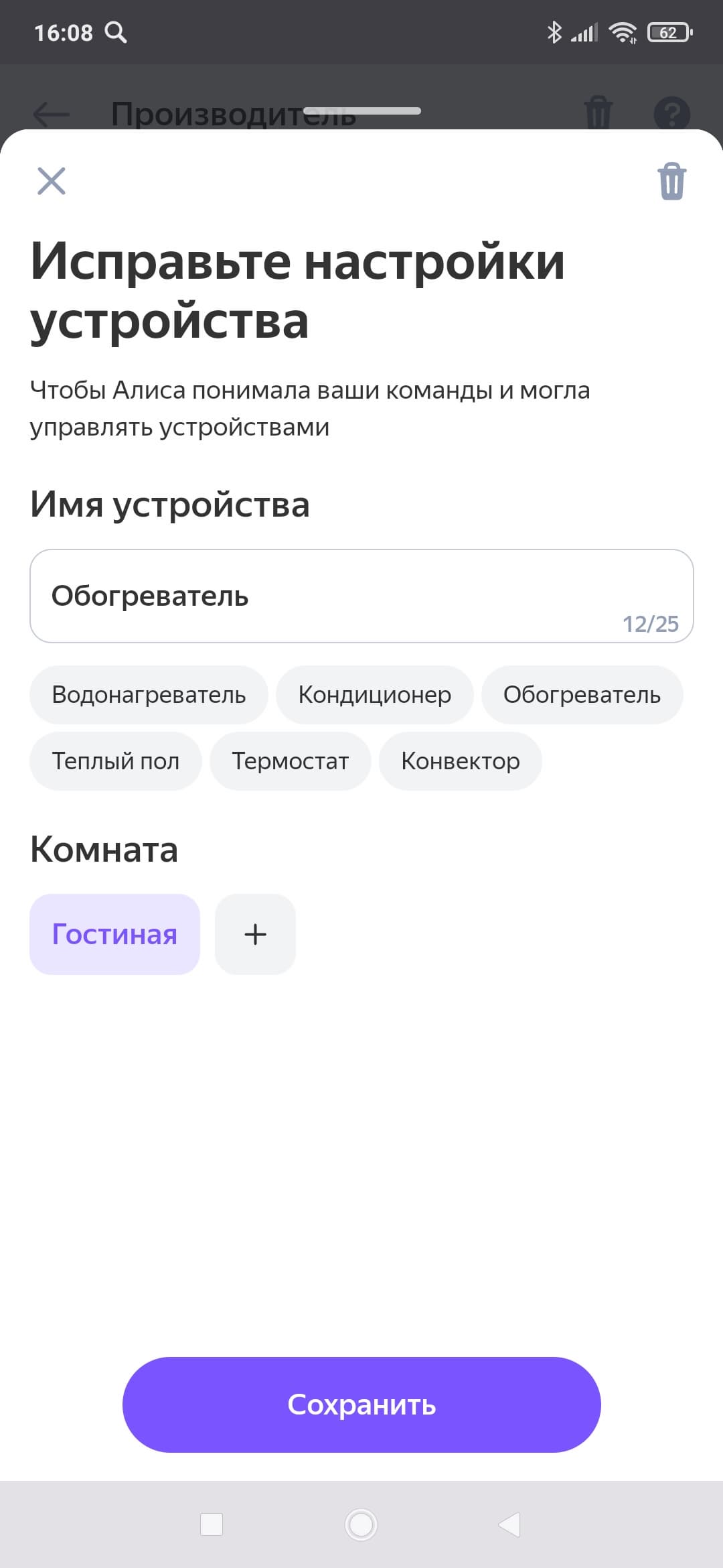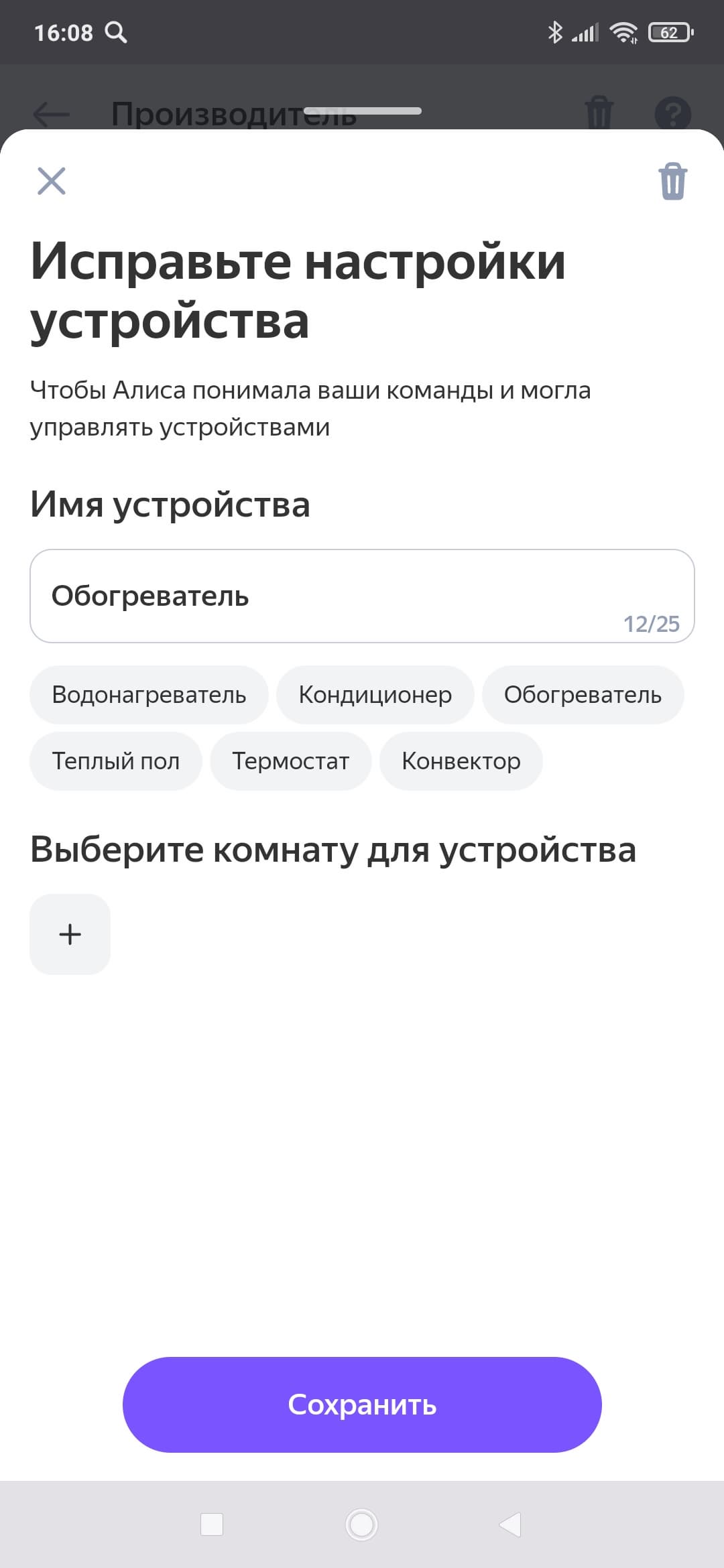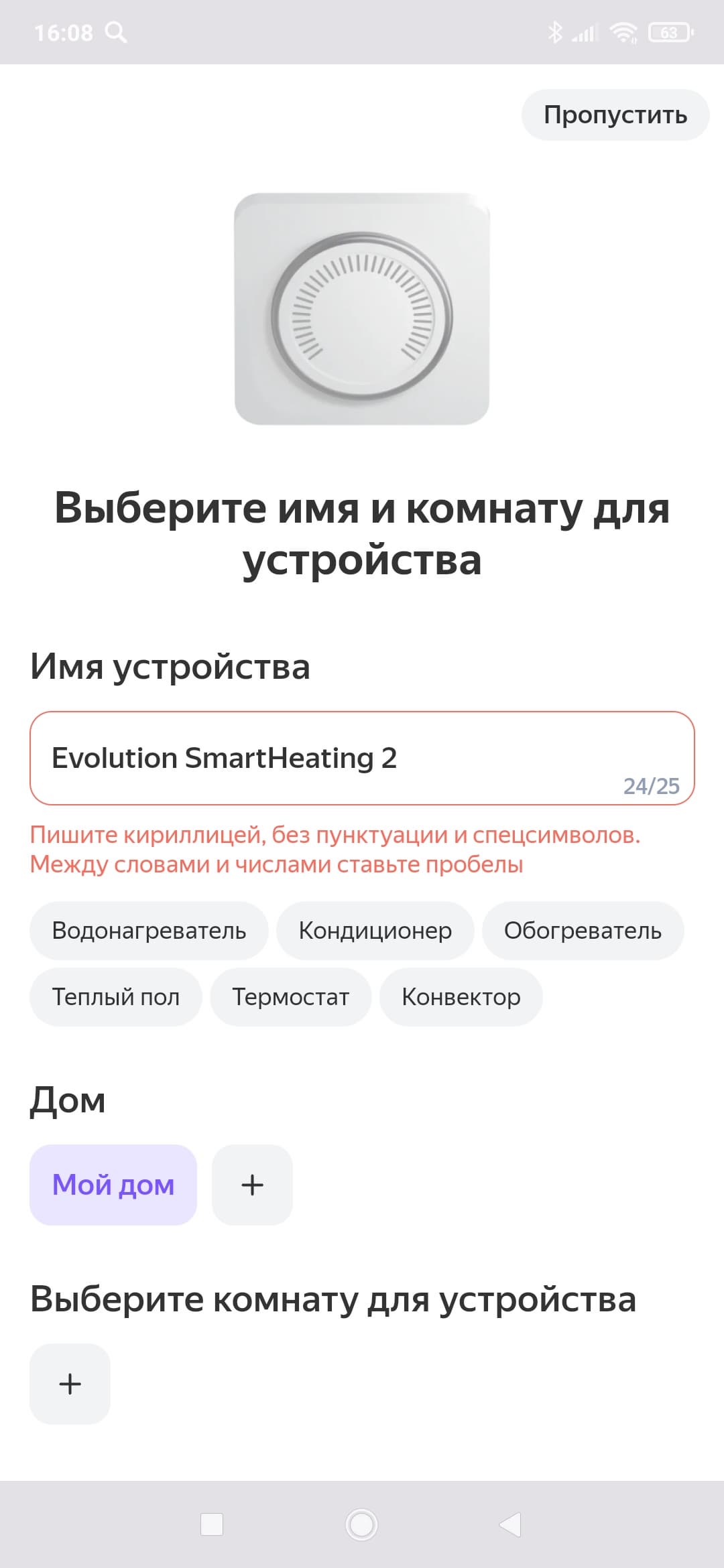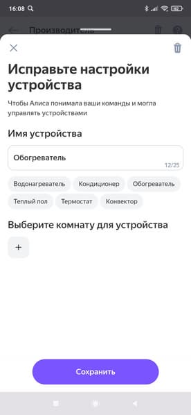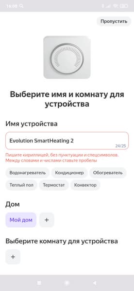 После того, как доступ предоставлен, нам предстоит дать устройству новое имя (только кириллицей!) и указать, в каком помещении будет установлен обогреватель.