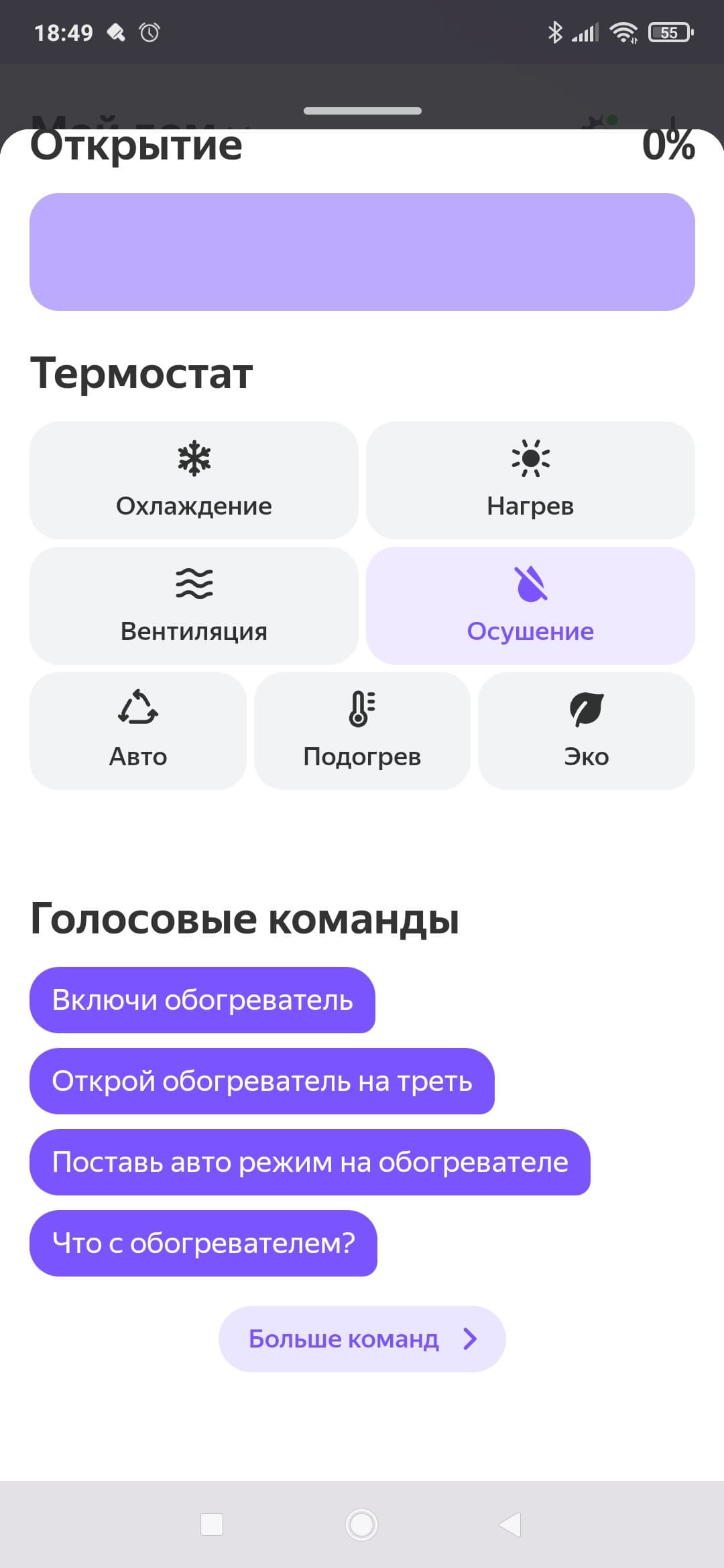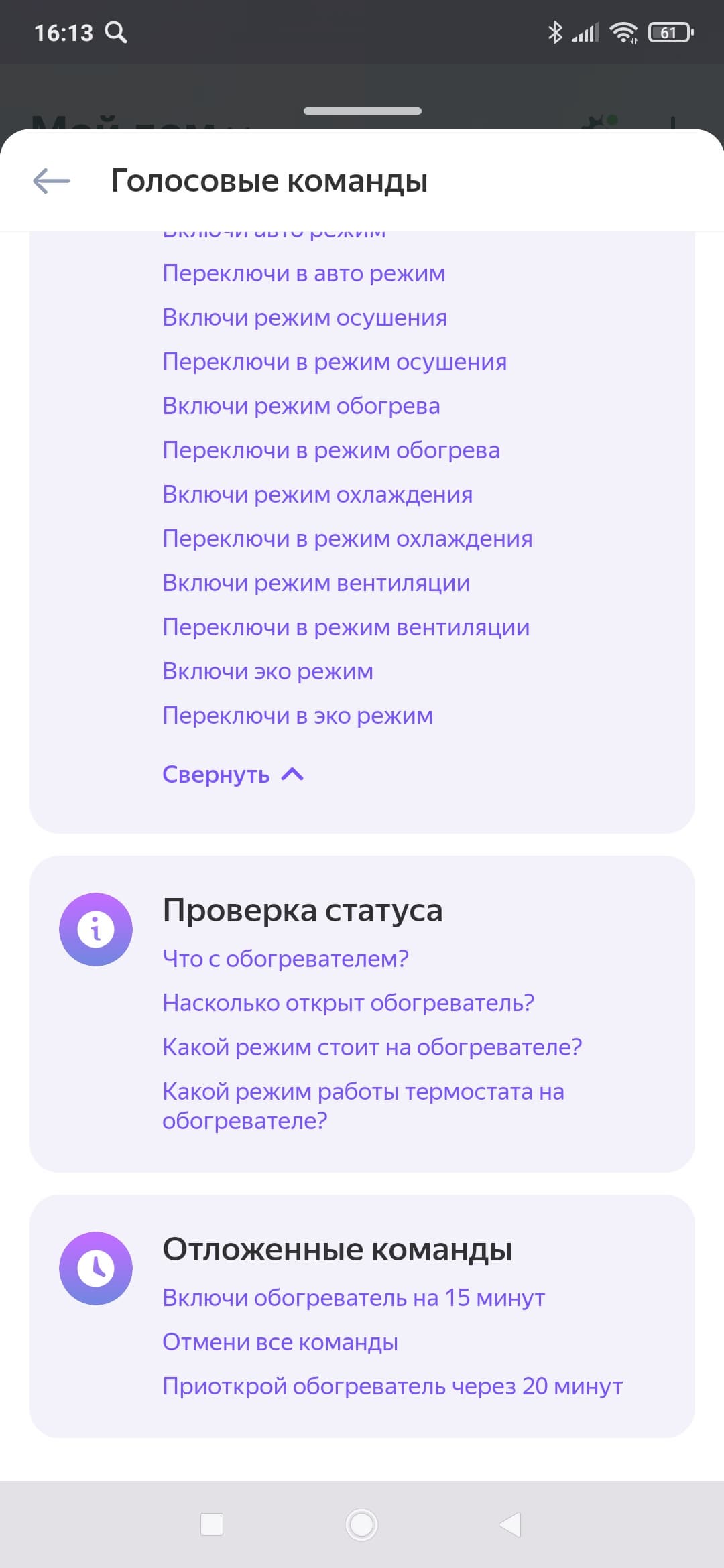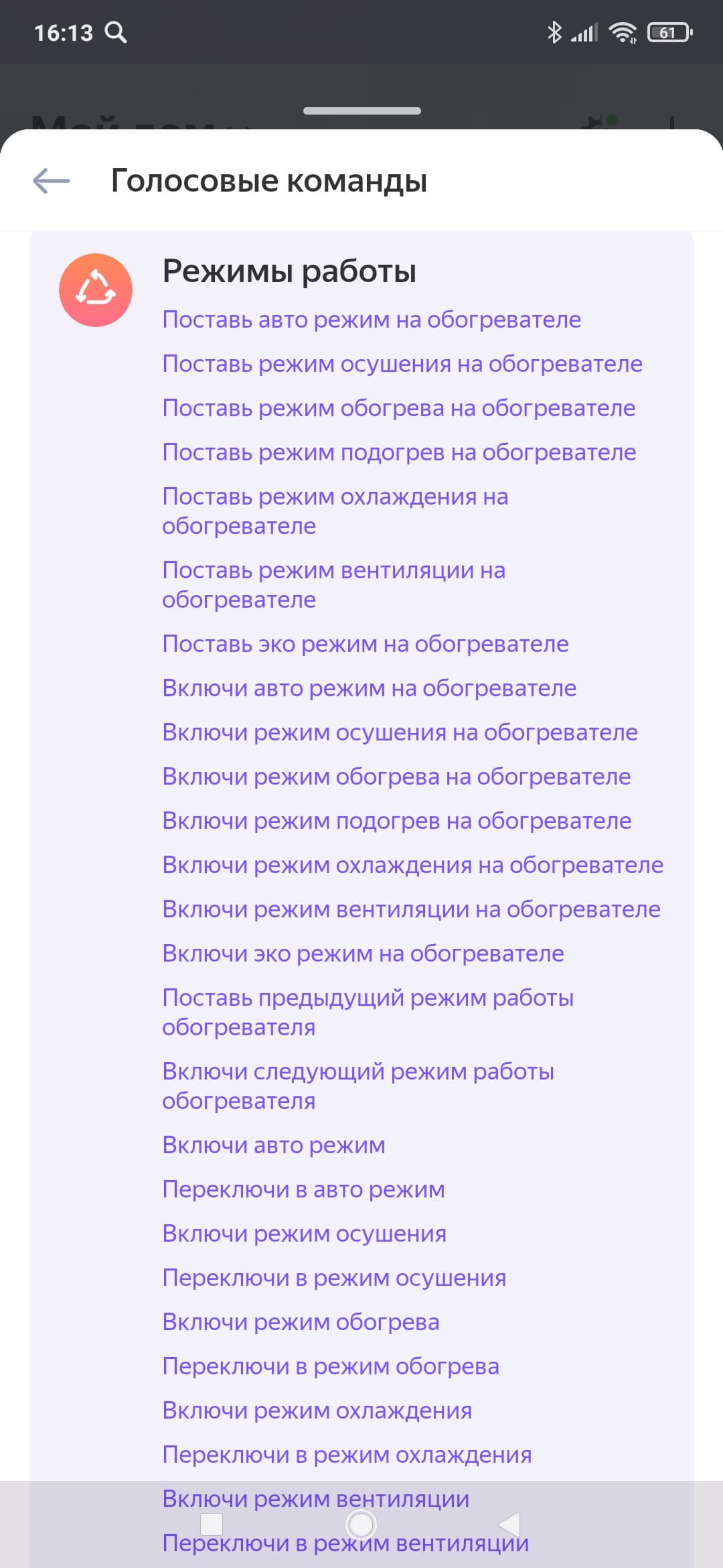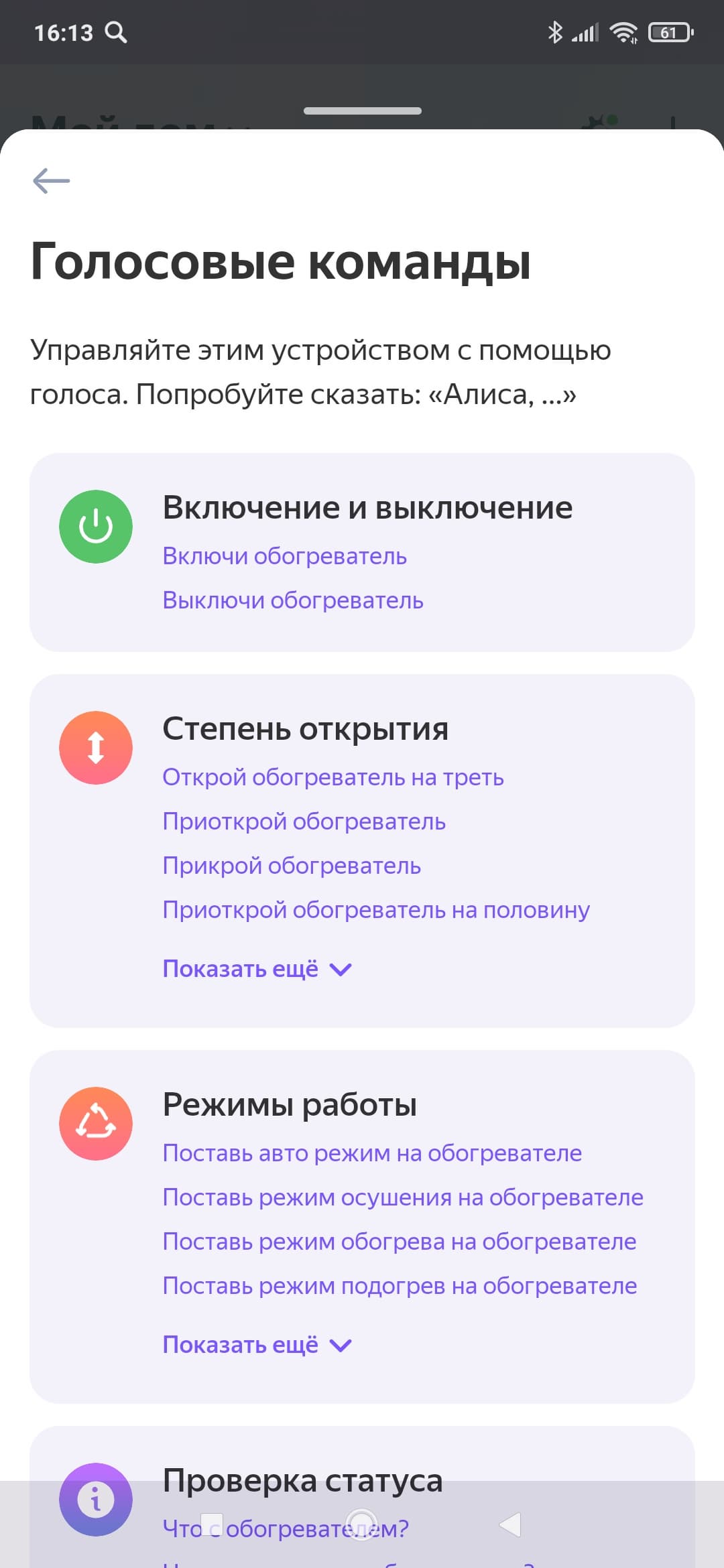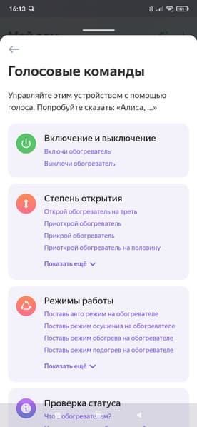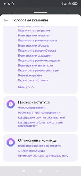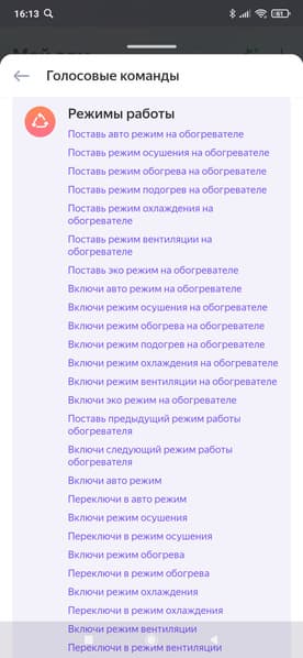 Список голосовых команд повторяет функциональность, представленную в главном окне управления прибором. Тут, помимо выбора режимов, мы можем проверить статус устройства, а также включить и отключить прибор по таймеру.