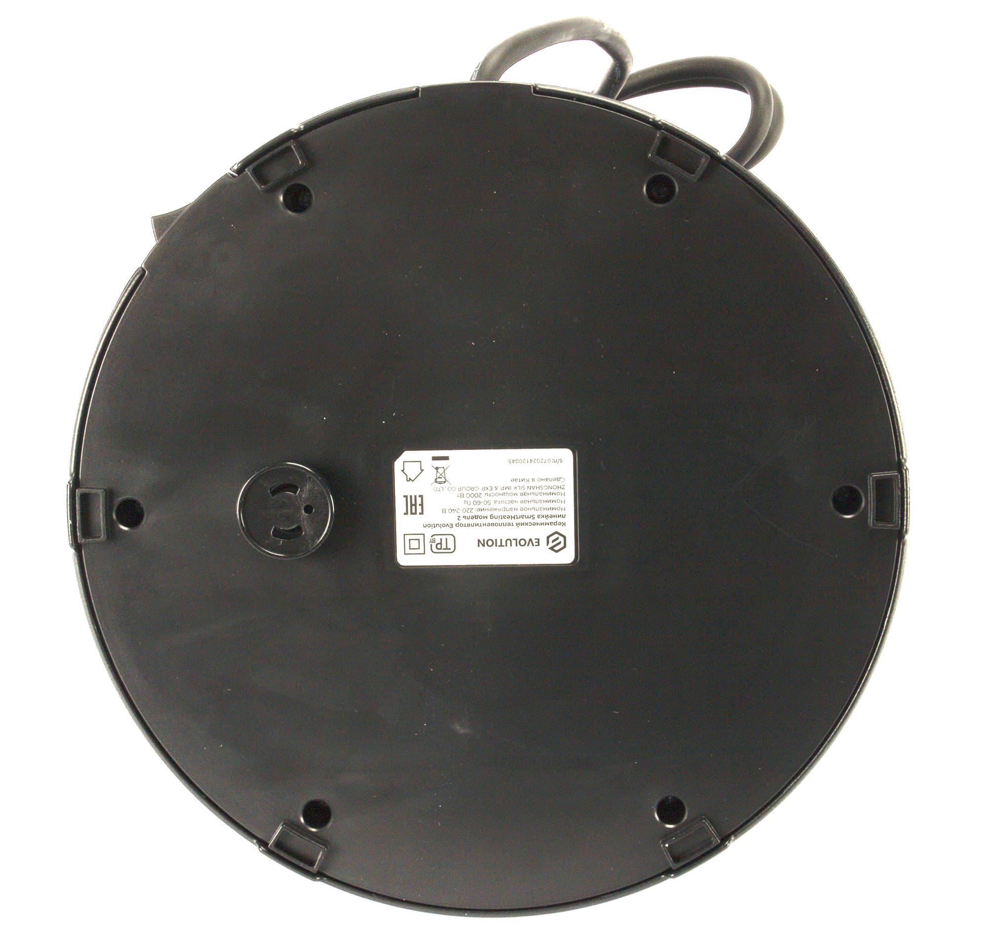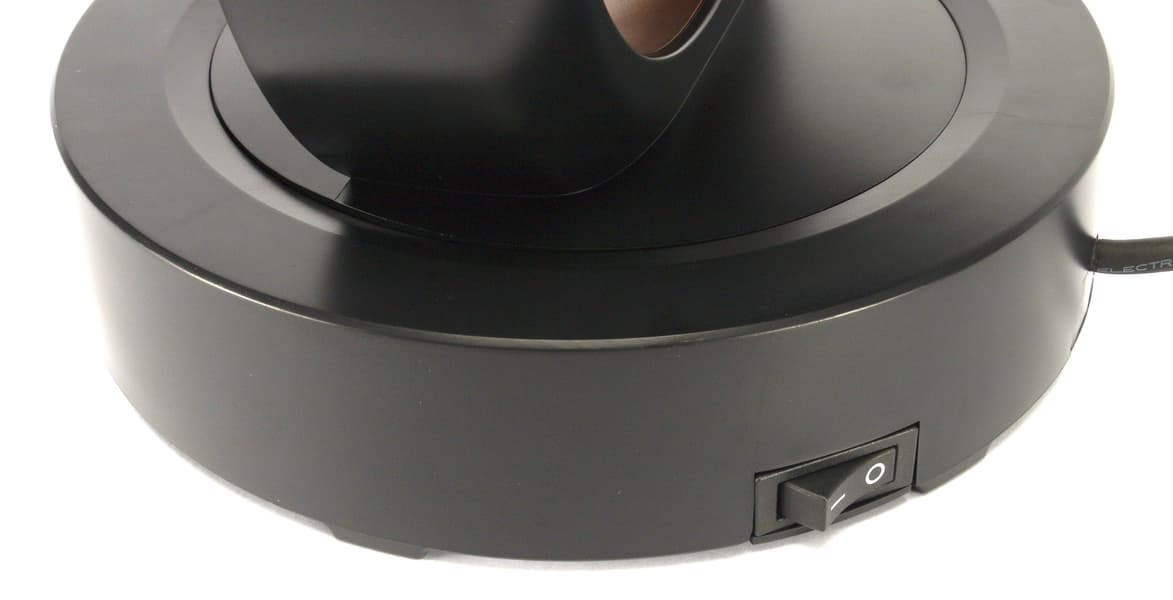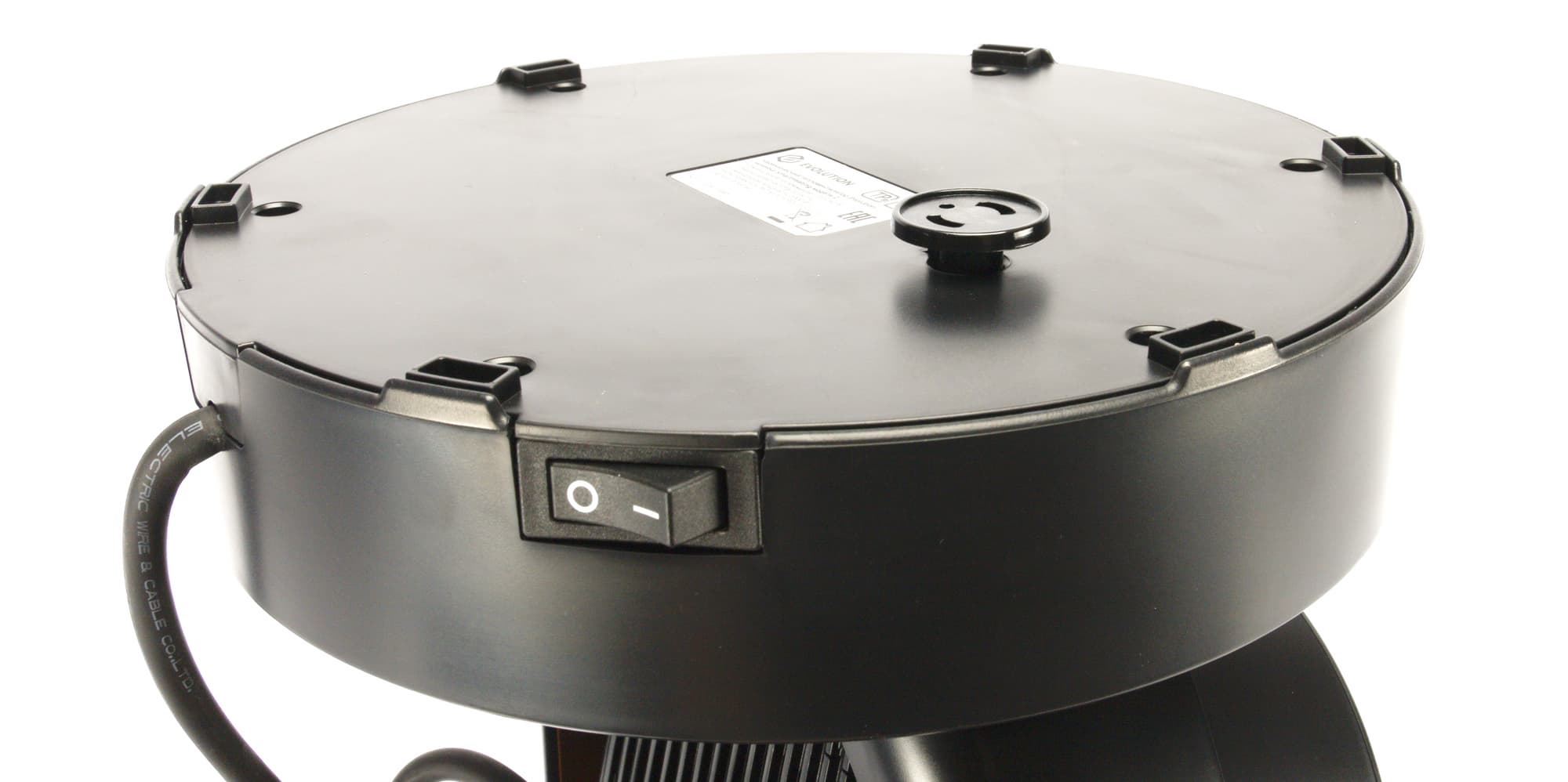 Отсека для наматывания излишков шнура у прибора не предусмотрено. На нижней части подставки находится наклейка с технической информацией об устройстве, а также механическая кнопка, отвечающая за отключения прибора при падении. Мы находим такое решение простым и надежным.