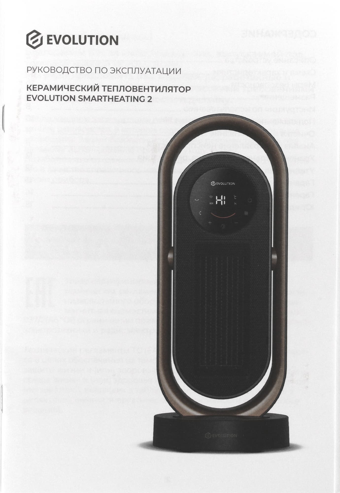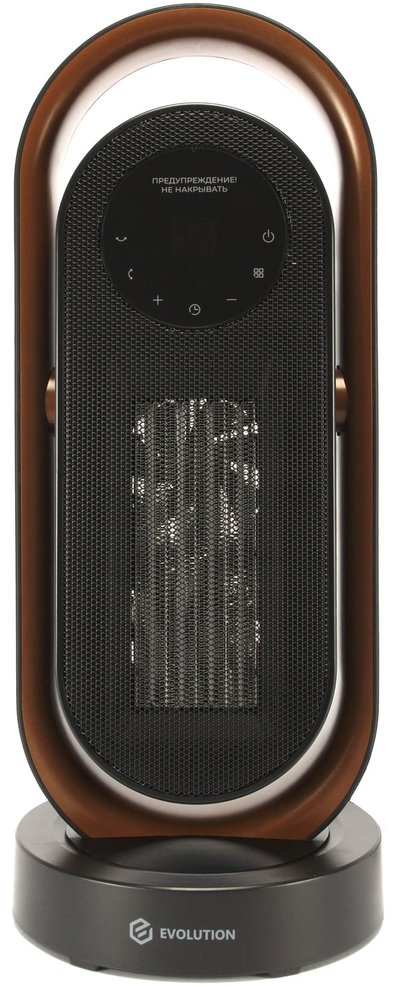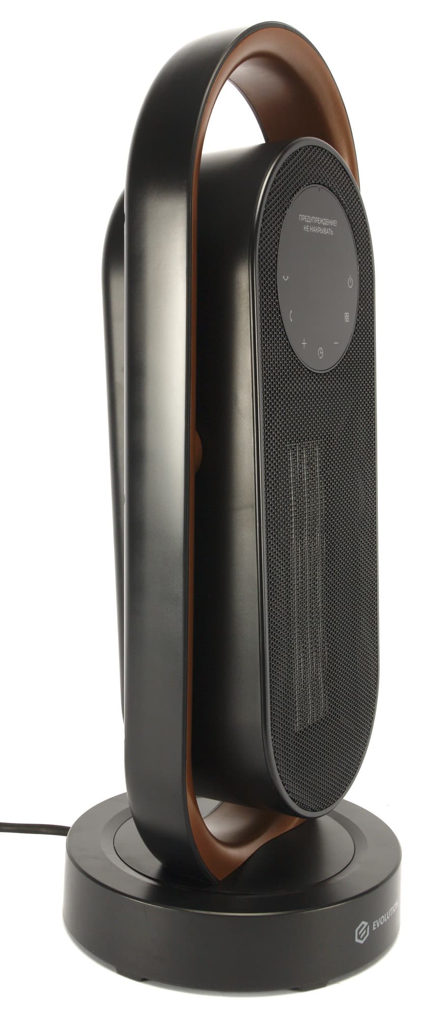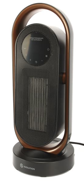 Тепловентилятор крепится на пластиковой подставке, на передней части которой мы видим логотип Evolution.