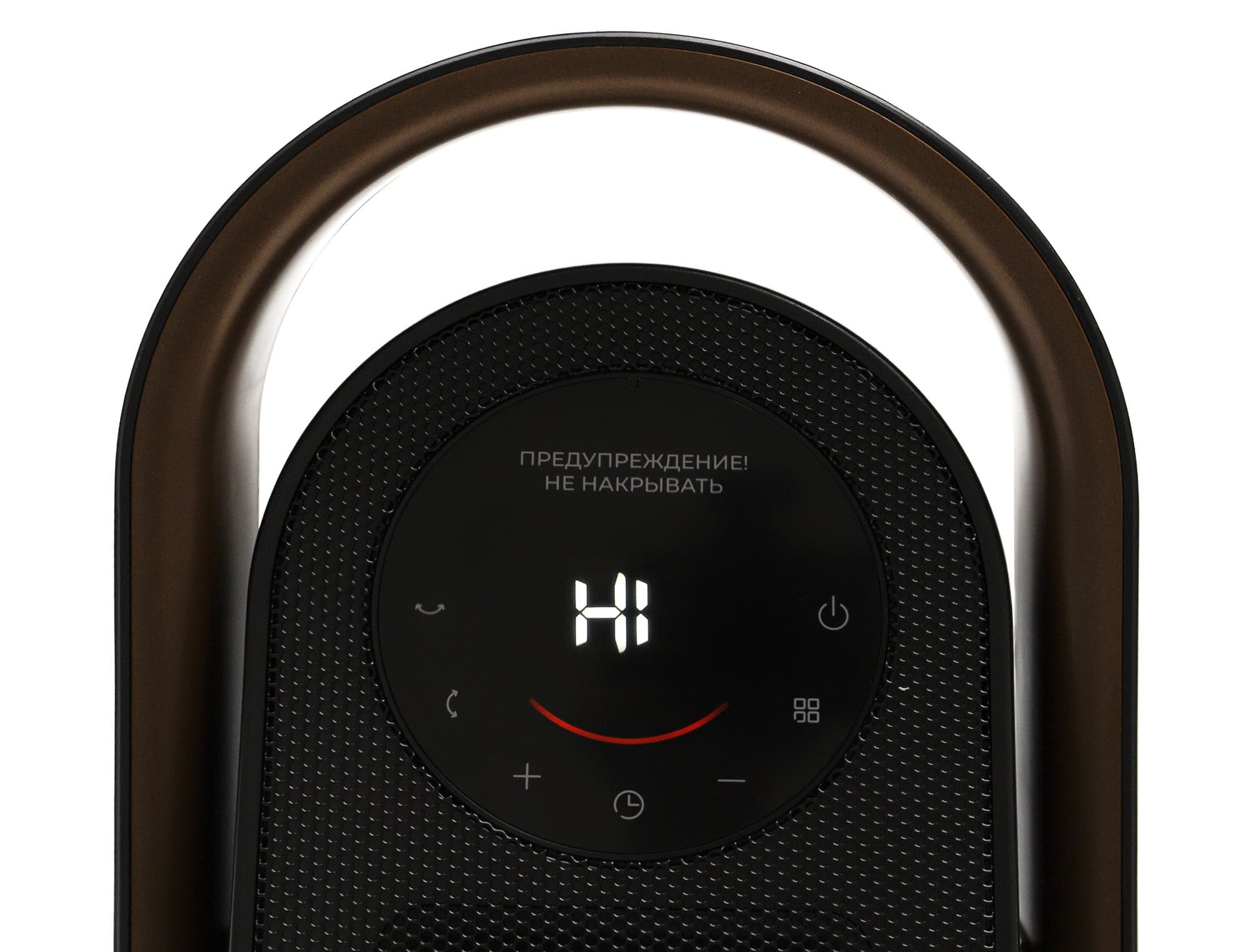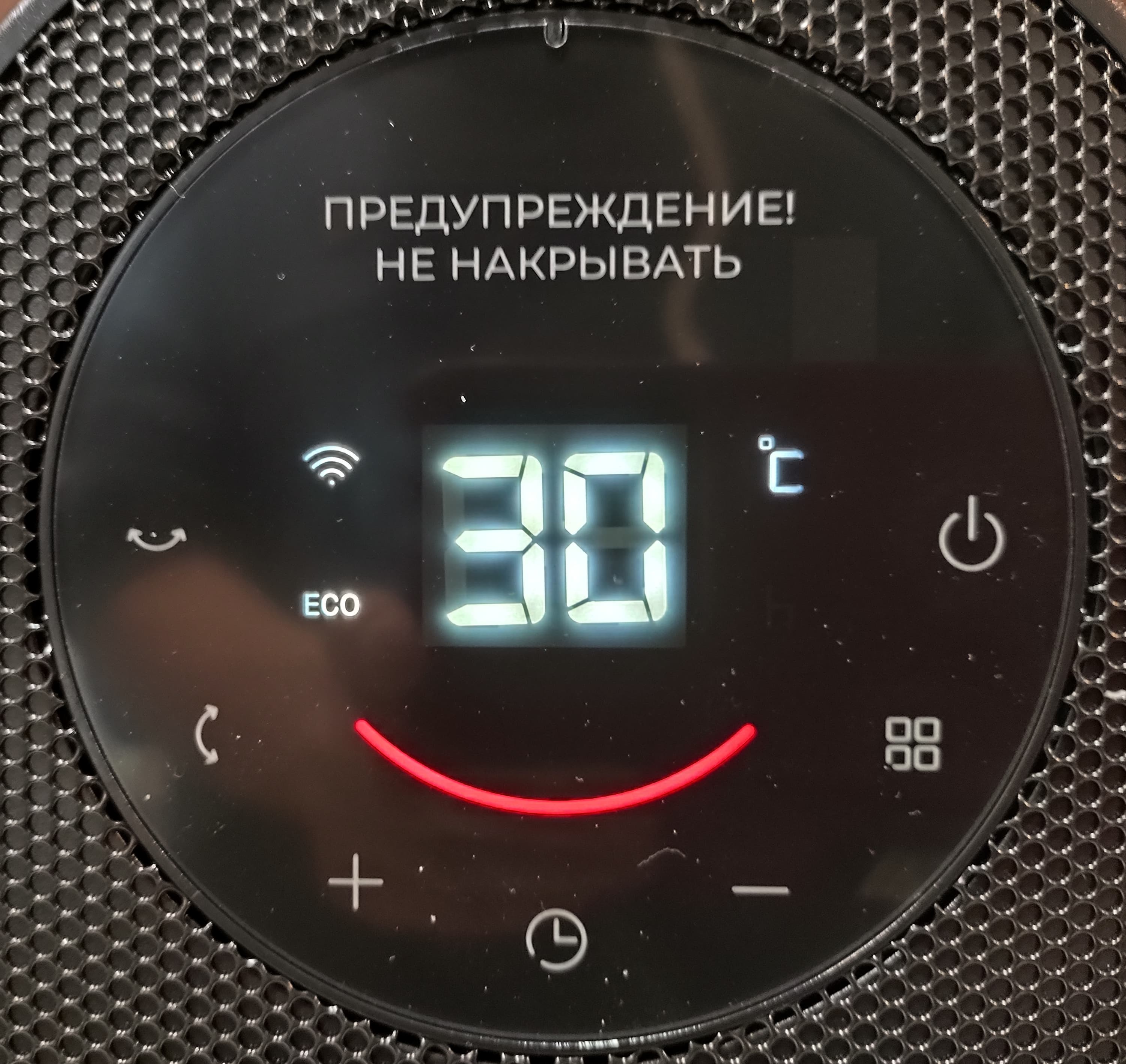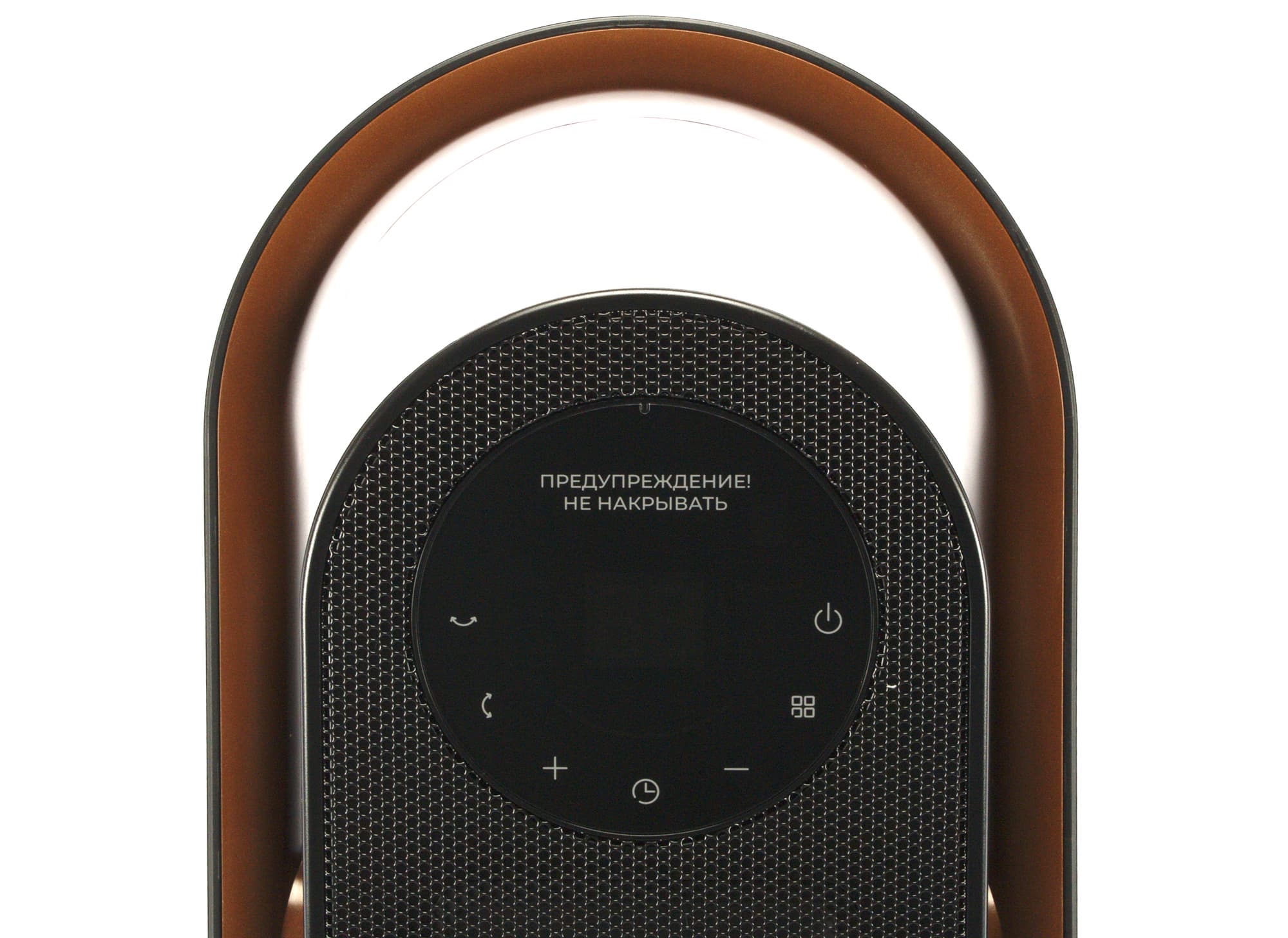 Передняя сторона закрыта металлической сеткой. Круглая панель управления с сенсорными кнопками и светодиодной индикацией размещена в верхней части устройства. Тут же находится предупреждение о том, что прибор ни в коем случае нельзя накрывать одеждой или тканью. От себя добавим, что не стоит размещать тепловентилятор и рядом со шторами.