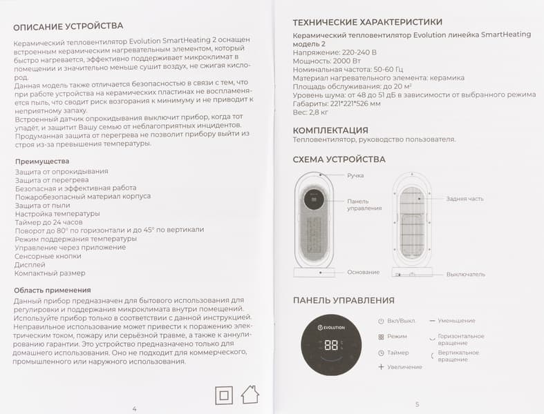 Керамический тепловентилятор Evolution SmartHeating 2 — это компактное и «умное» (поддерживающее управление со смартфонов, а также посредством Алисы «Яндекса») устройство, предназначенное для обогрева квартиры или дома. Устройство не имеет вращающихся лопастей, которые может задеть пользователь, а мощность прибора составляет внушительные 2000 Вт.