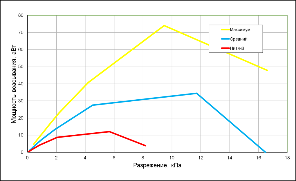 Мощность всасывания мы определяли при работе пылесоса без трубы и насадок. Зависимость мощности всасывания от создаваемого разрежения приведена на графике ниже: