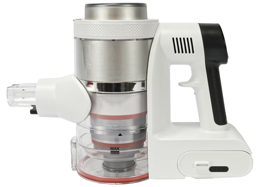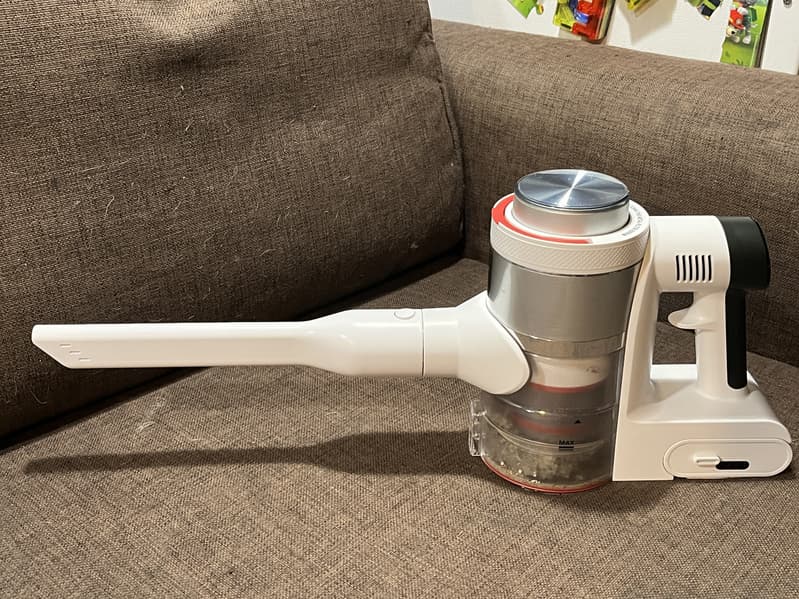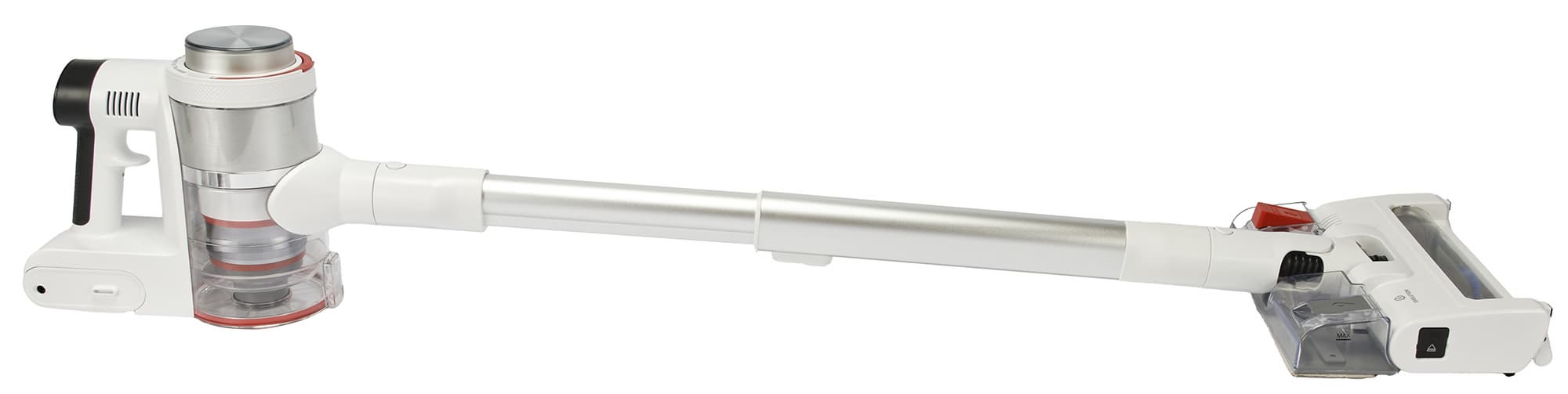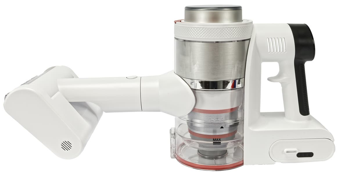 Собрав пылесос в конфигурации для классической уборки и воспользовавшись им непродолжительное время, мы сразу оценили удобную конструкцию ручки с разделителем для пальцев. Вес устройства в полной сборке получается ощутимым и благодаря этому разделителю устройство надежно зафиксировано ладонью и пальцами, а нагрузка распределяется равномерно на всю руку, что облегчает эксплуатацию.