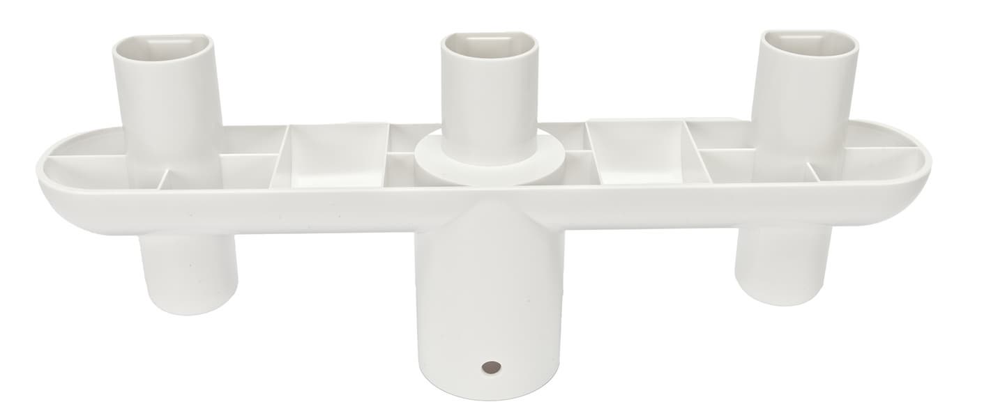 А также имеется парковочный модуль для насадок, состоящий из двух частей — крупной на три насадки и малой — на одну, которые можно присоединить к док-станции снизу посредством вставки модулей в док-станцию. Фиксация произойдет за счет тугих пластиковых защелок-кнопок.