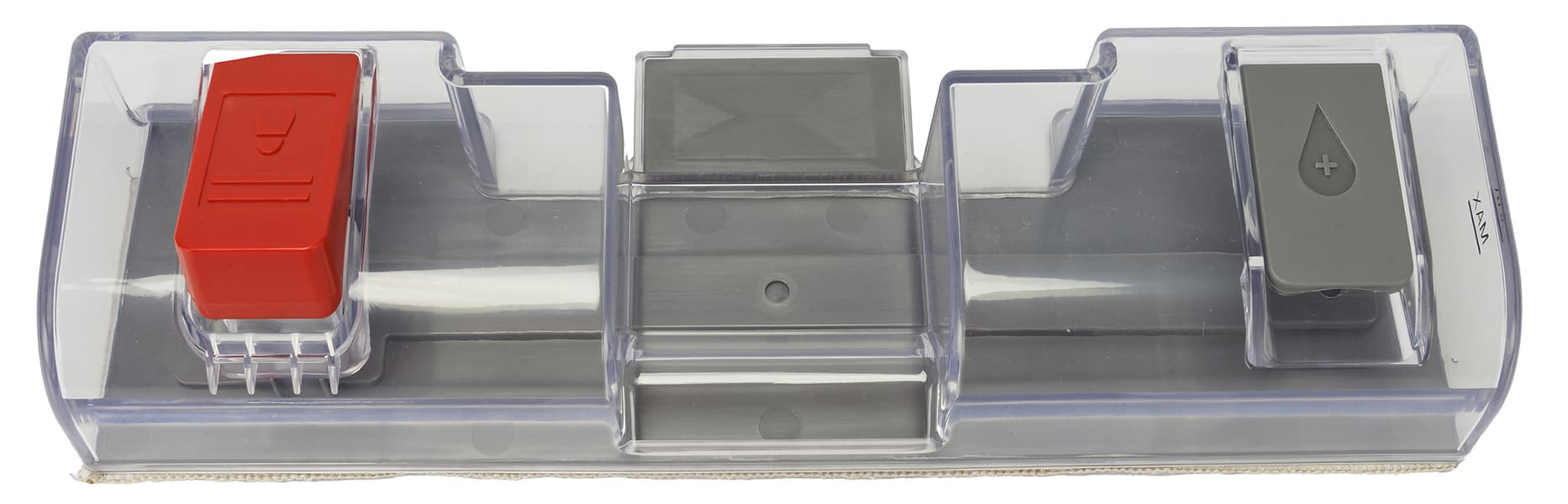 Блок для чистой воды легко и надежно фиксируется на универсальной насадке благодаря магнитам, находящимся на небольших выступающих платформах моторизированной насадки и самого контейнера.