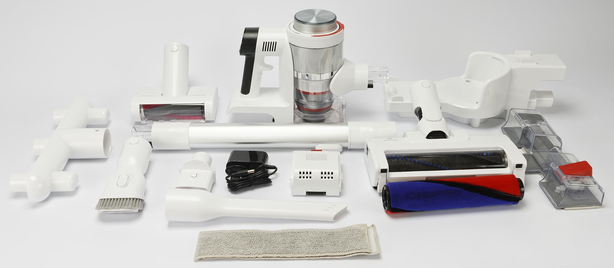 Моторный блок сделан из белого, красного и черного пластика. То же самое относится почти ко всем остальным деталям устройства: основной цвет — белый, дополнительные — красный и черный. Исключением является только крупный мягкий валик для мытья пола — здесь помимо общей цветовой гаммы, имеется также синий цвет.