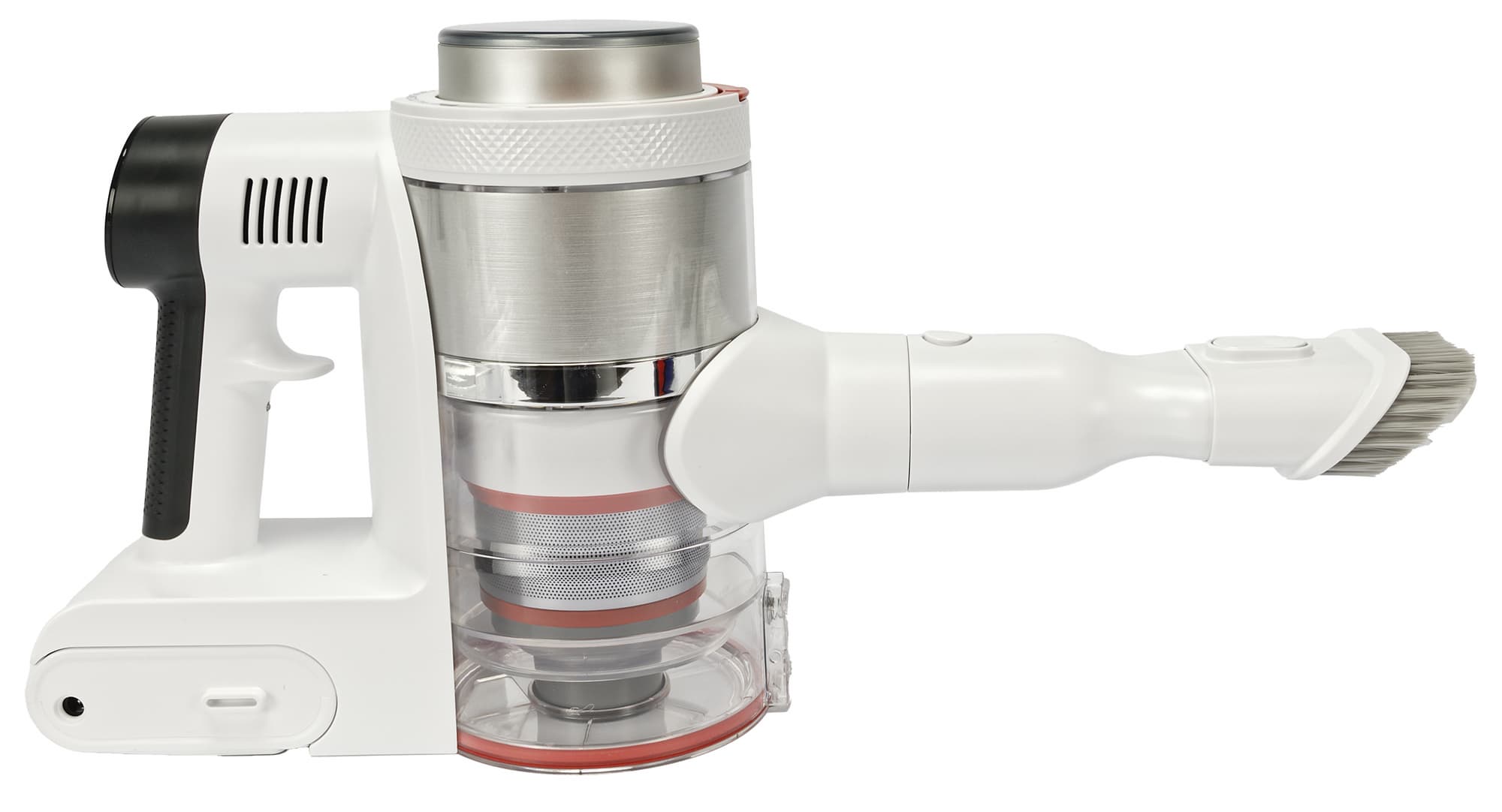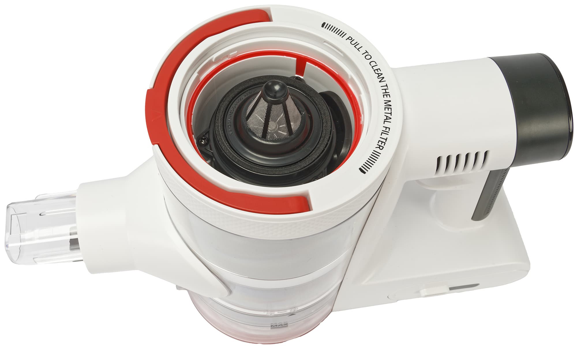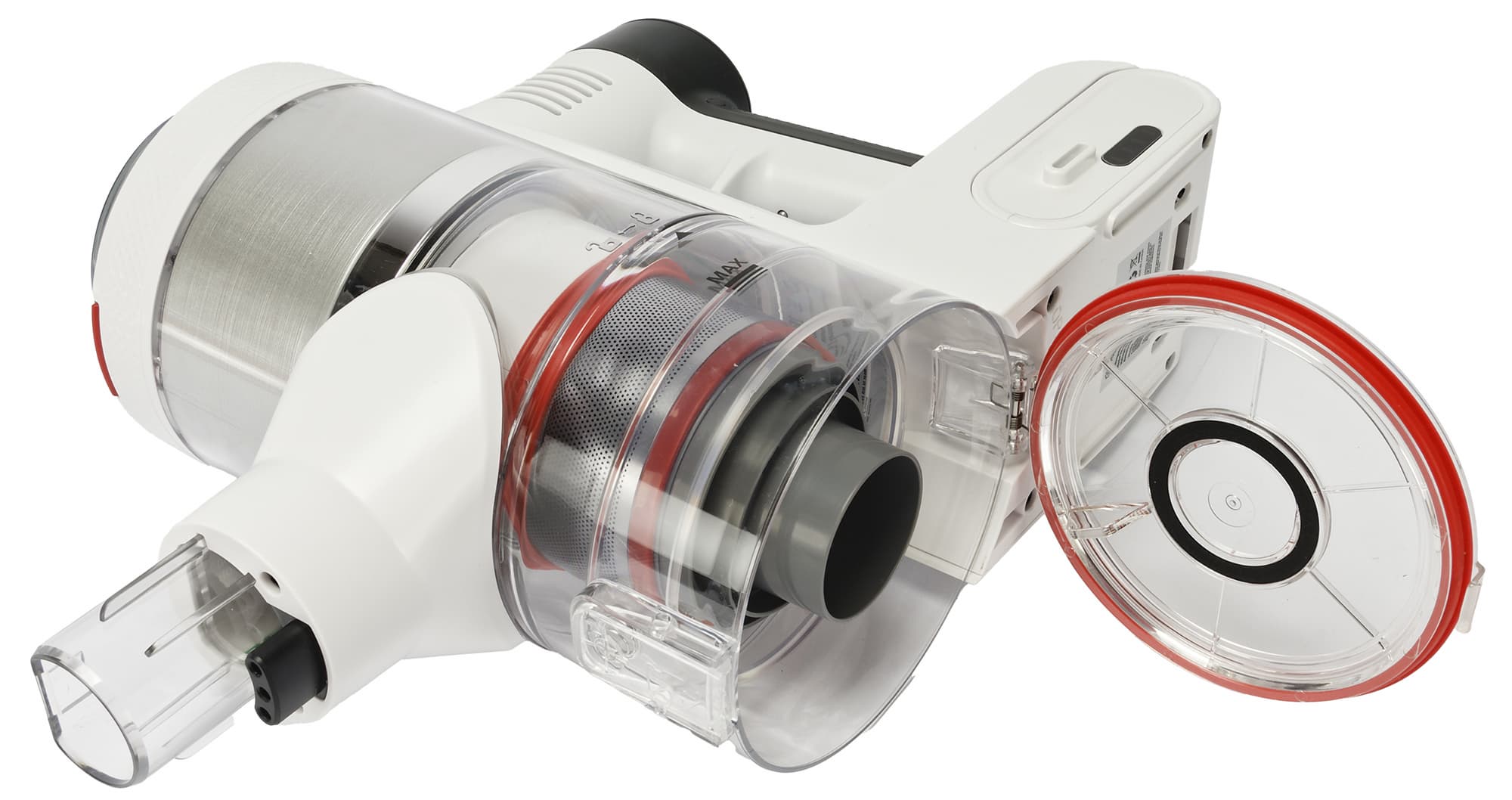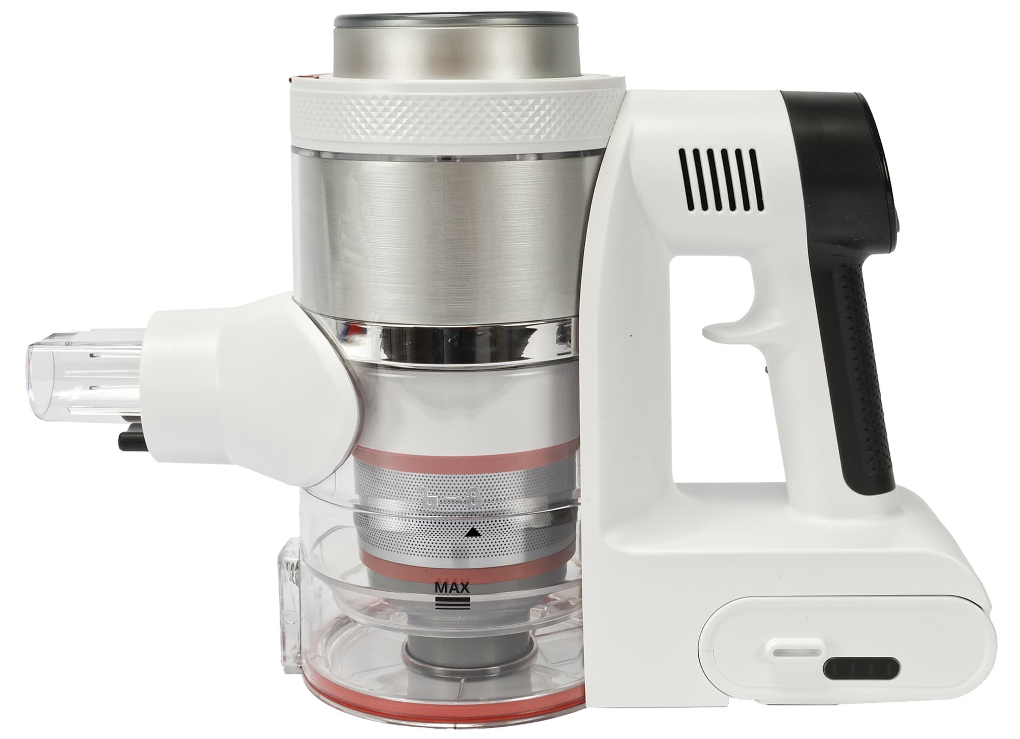 Спереди на корпусе находится место крепления насадок или удлинительной трубки. А в нижней части мы видим прозрачный отсек для мусора с установленными внутри фильтрами.