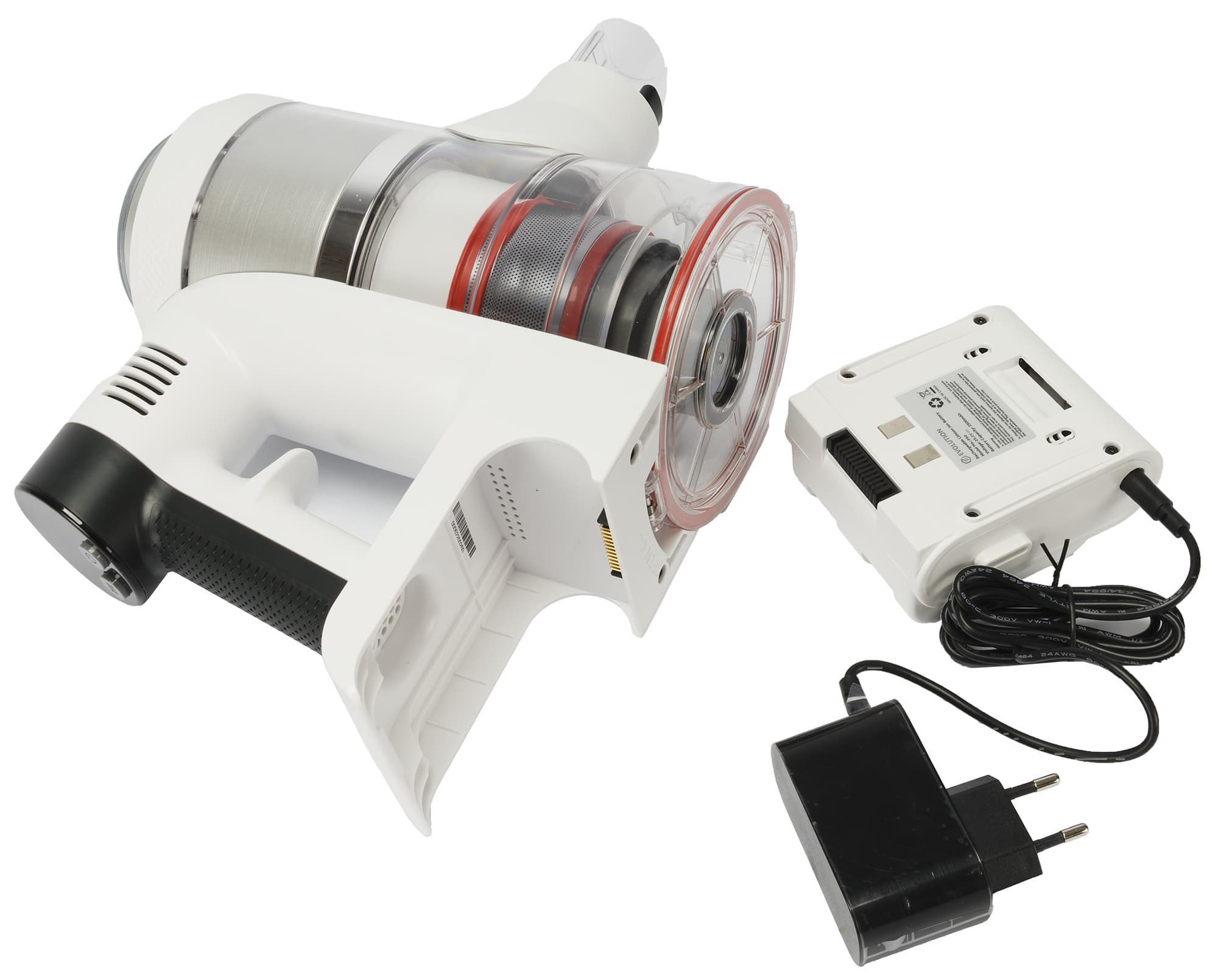 Съемный аккумулятор подключается к пылесосу 10-контактным разъемом, фиксируется одним простым движением, отстегивается при нажатии на небольшую красную кнопку на торце аккумулятора. Заявленные характеристики аккумулятора — 25,2 Вт, 2500 мА·ч.