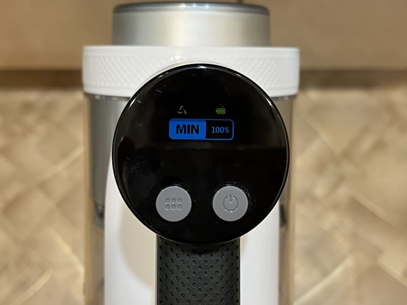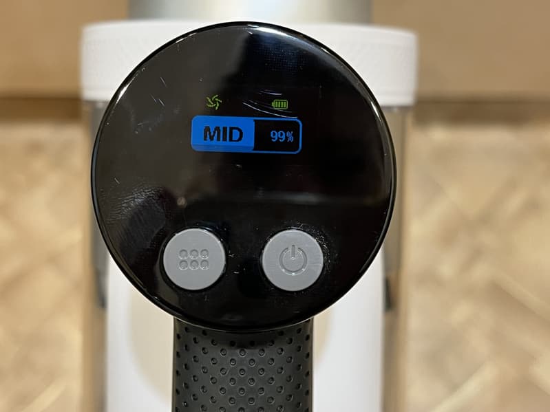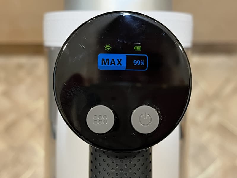 Мы начали тестирование с автоматического режима. В этом режиме пылесос самостоятельно выбирает уровень мощности в зависимости от степени загрязнения поверхности. Это позволяет более эффективно расходовать заряд аккумулятора. При этом на дисплее мы сразу же видим проценты заряда, по которым мы сами должны догадываться, сколько еще проработает устройство без подзарядки.
