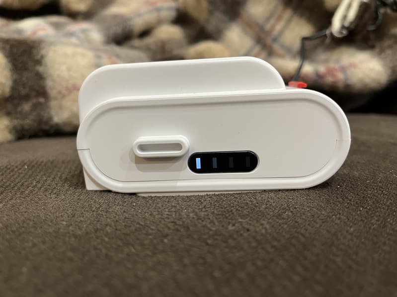 На аккумуляторе, снятом с корпуса прибора и поставленном на зарядку, мы видим индикатор с четырьмя делениями, которые поочередно мигают в процессе подзарядки, а постепенно «заполняясь», начинают гореть непрерывно. Это удобно, так как индикатор показывает хотя бы примерный уровень заряда на данный момент (без установки в корпус) и при необходимости можно снять аккумулятор с зарядки досрочно и воспользоваться им хотя бы для быстрой уборки.