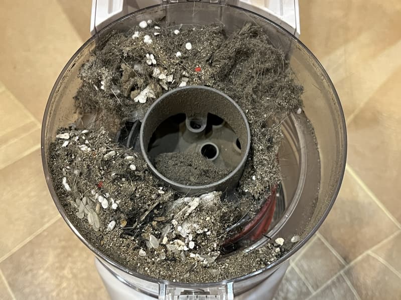 Во время сухой уборки мы не вытряхивали контейнер, и к концу влажной уборки в нем накопилось достаточно много мусора. Как можно видеть на фотографии, пылесос прекрасно засасывает как мелкие песчинки, так и невесомые крупные гранулы пенопласта: