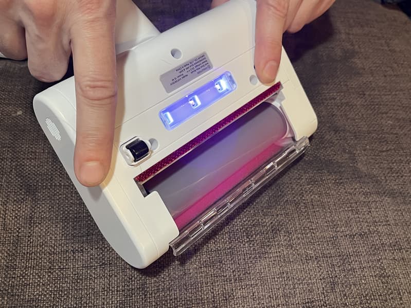 Затем мы изучили антиклещевую насадку. Выяснили, что УФ-подсветка в ней загорается только при соприкосновении с поверхностью, а если быть точнее — при нажатии на правое колесико.