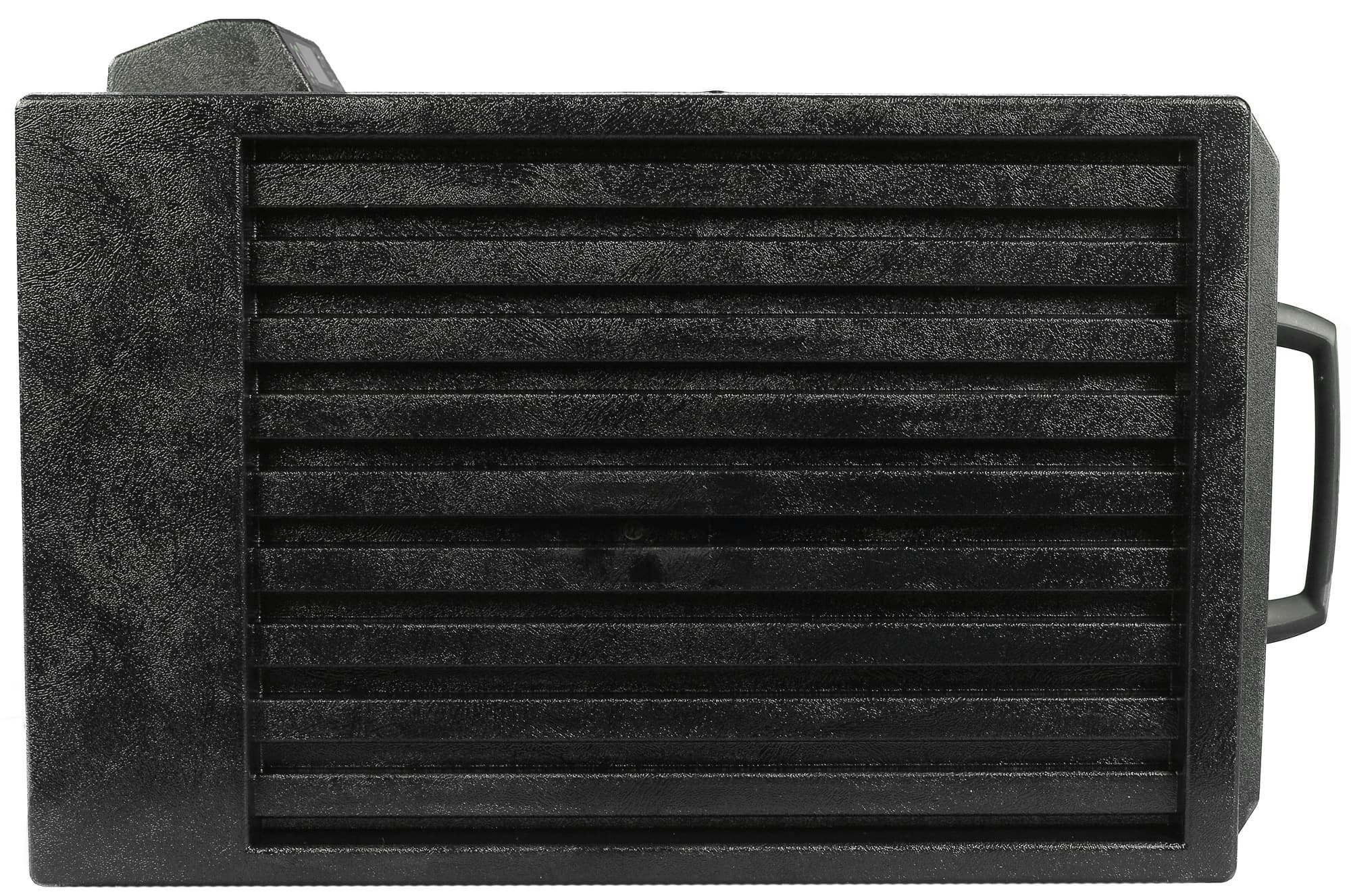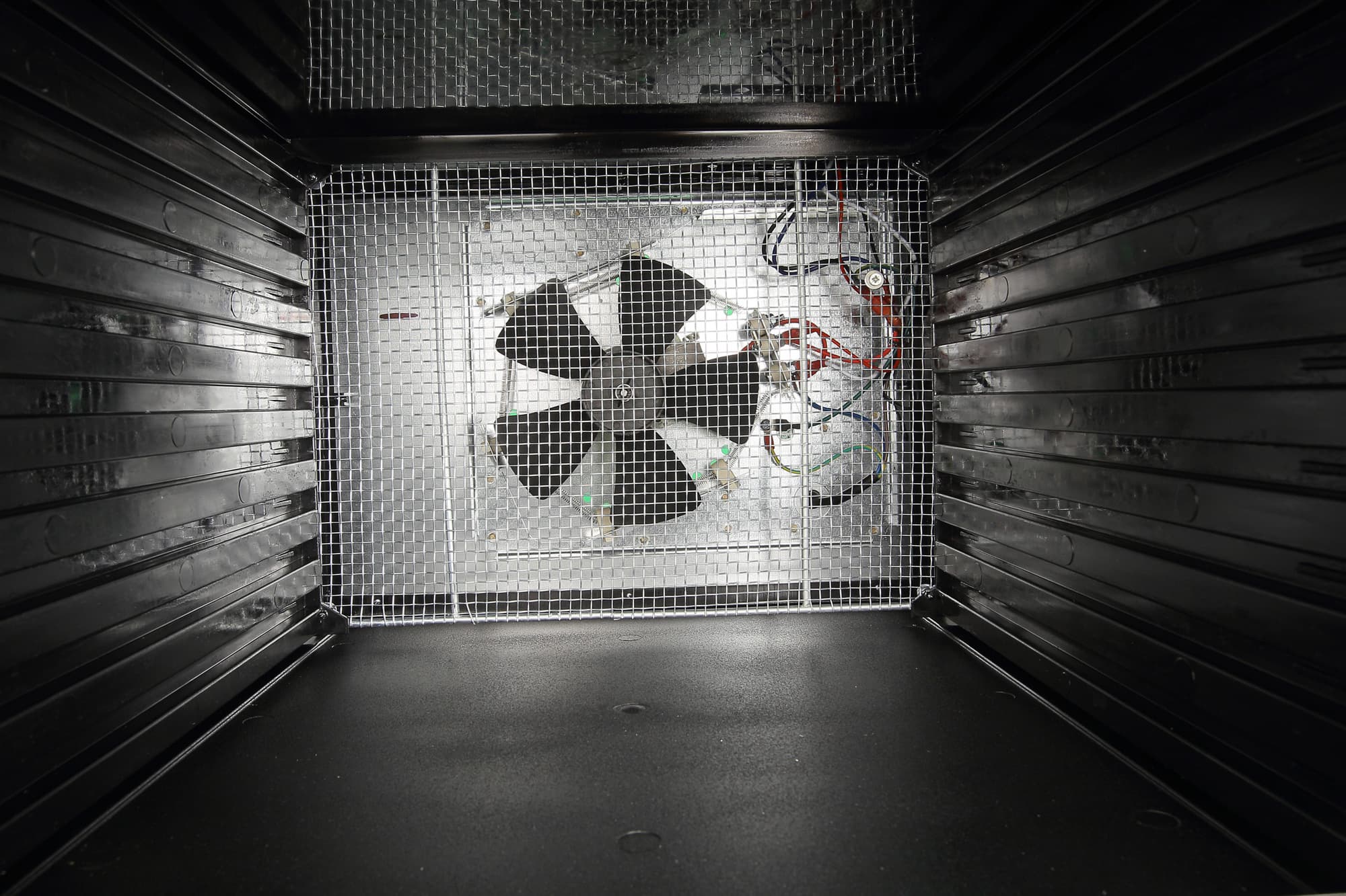 Заглянув внутрь, можно увидеть не только выемки для установки поддонов, но также и внутреннее устройство прибора: провода, 7-дюймовый вентилятор (17,8 см в диаметре), а также небольшой нагревательный элемент, скрытые за защитной сеткой. Где-то там же, похоже, расположен и датчик температуры. Некоторые внутренние элементы закреплены с применением пружин (которые, судя по всему, предназначены для погашения ненужных вибраций).