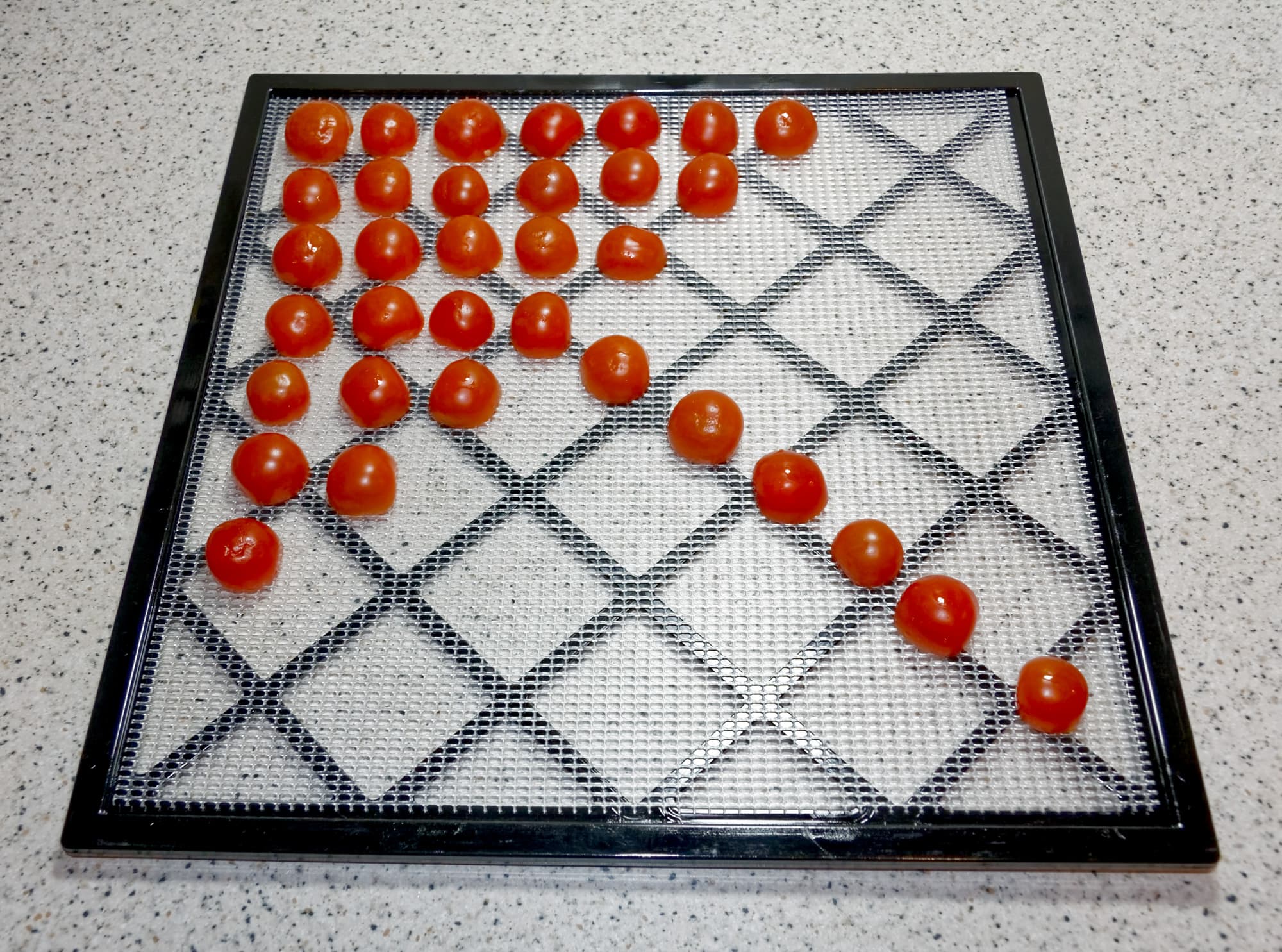 Для этого теста мы взяли два сорта томатов: обычные томаты-«сливы» и томаты-черри. Подготовка к дегидрации оказалась проста: черри оказалось достаточно разрезать пополам.