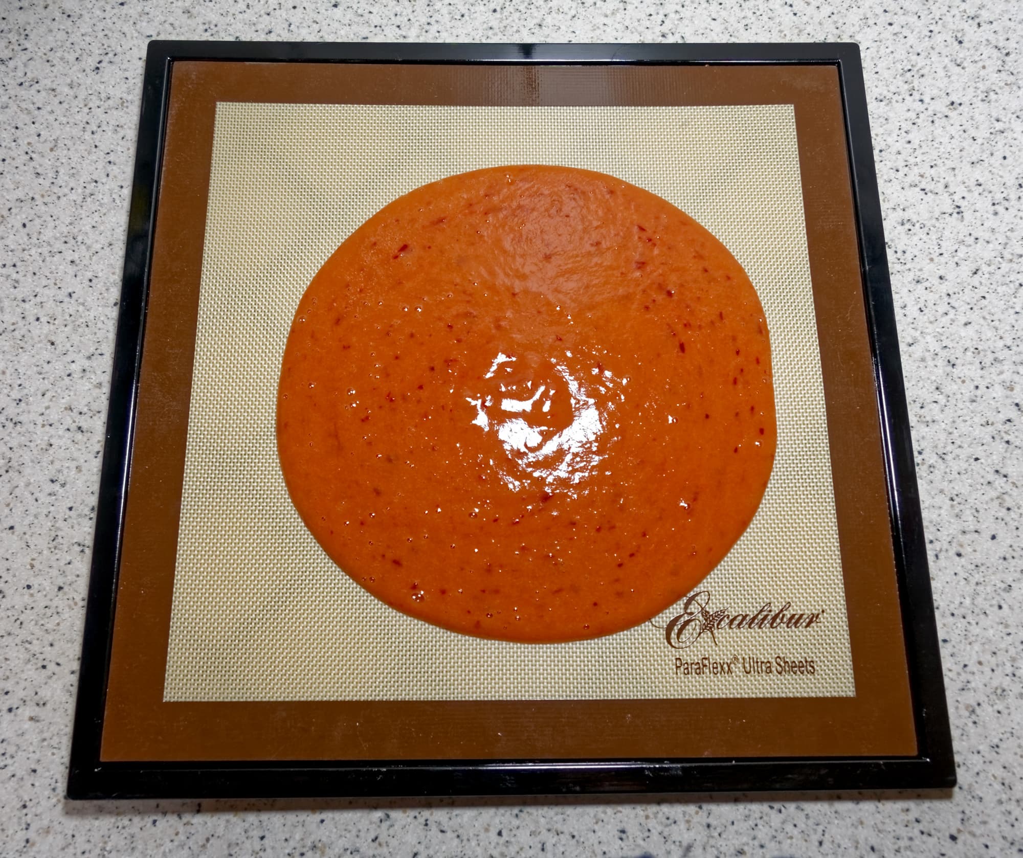 Исходное сырье было вымыто и подготовлено к измельчению — мы удалили косточки и вырезали помятые частицы. Затем фрукты были блендированы до однородного состояния, а смесь — разлита по листам из расчета 1,5-2 чашки на один лист.