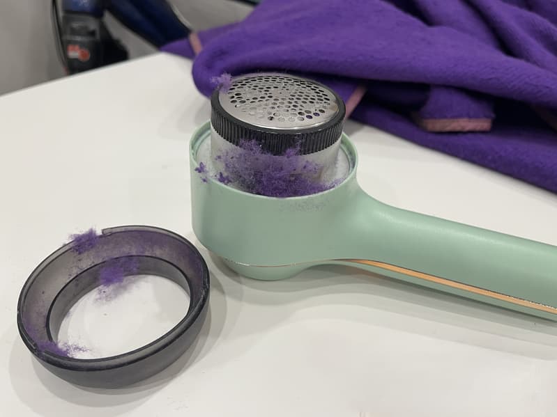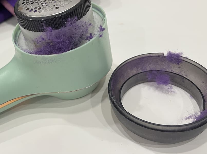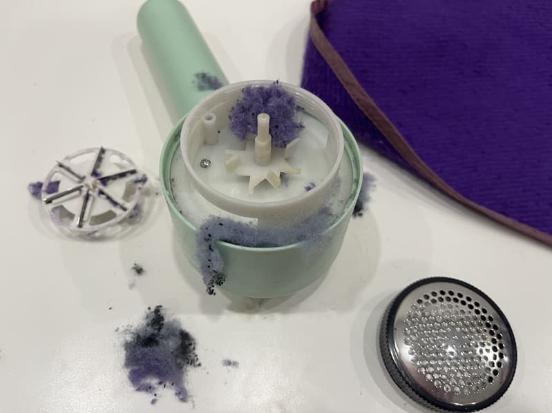 В 3 тестах из 4 наполняемость контейнера была умеренной, и нам почти не приходилось снимать нож с основания, чтобы почистить его. Но в тесте с синтетическим пончо катышки оказались недостаточно сформировавшимися, и машинка активно счищала как их, так и все волокна, торчащие рядом с ними. Это здорово усложняло процесс, и быстрая наполняемость контейнера, а также частички, застрявшие в ноже, вынуждали нас останавливаться каждые 2 минуты. При этом мы едва успели очистить квадрат ткани 4×4 см. В результате мы отказались от идеи приводить в порядок данное пончо.