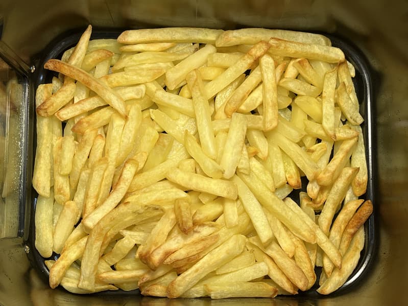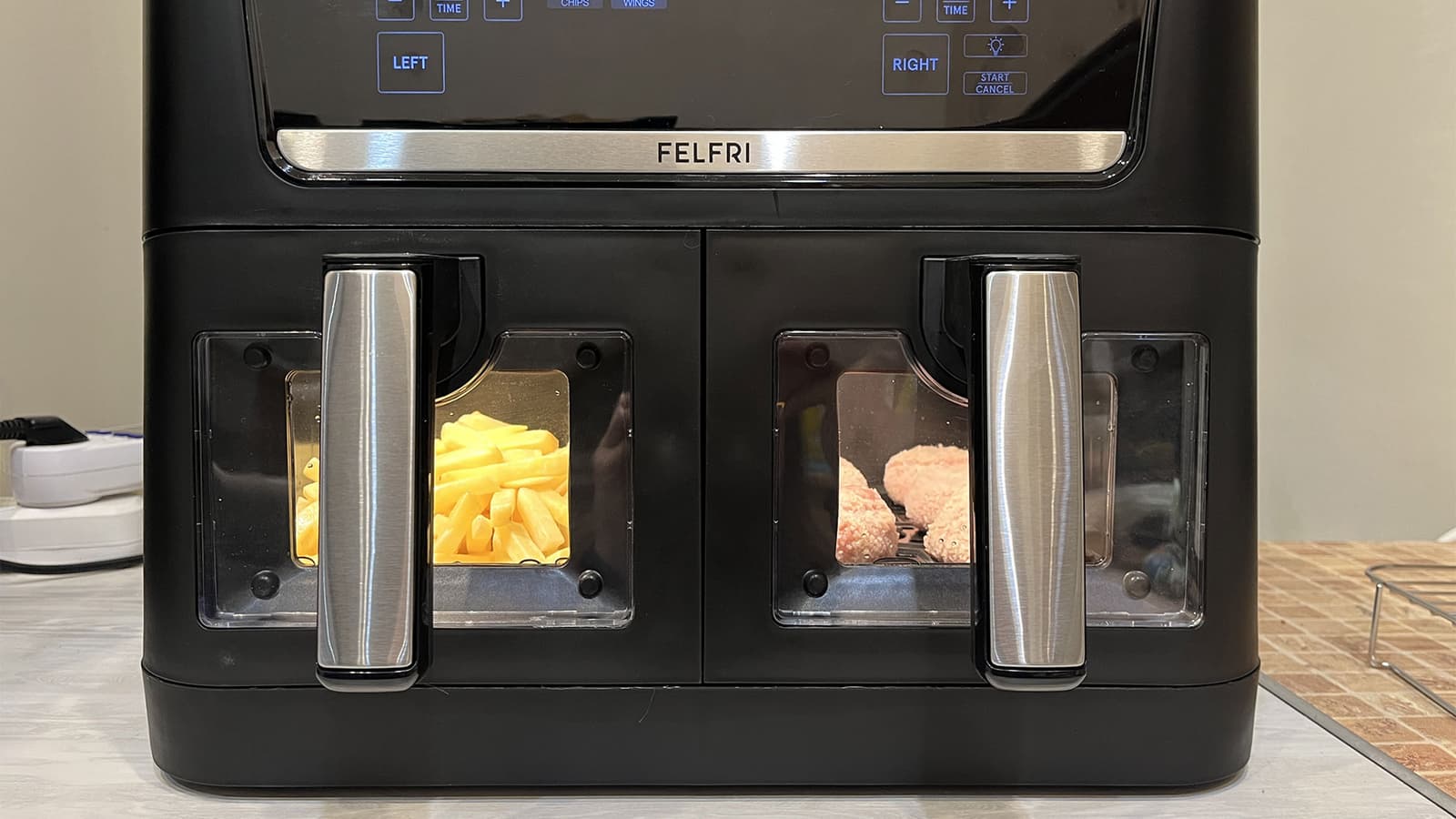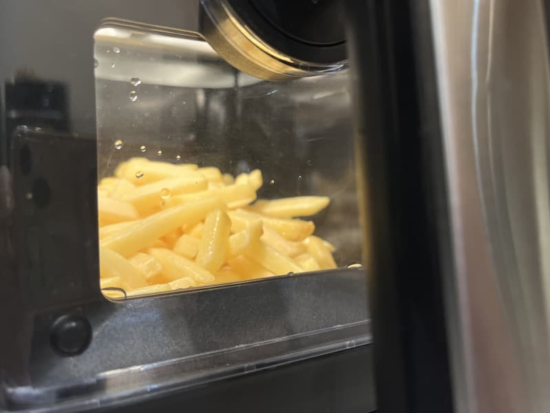 В данном тесте мы готовили два блюда параллельно: картофель-фри в левом лотке и куриные котлеты в правом.