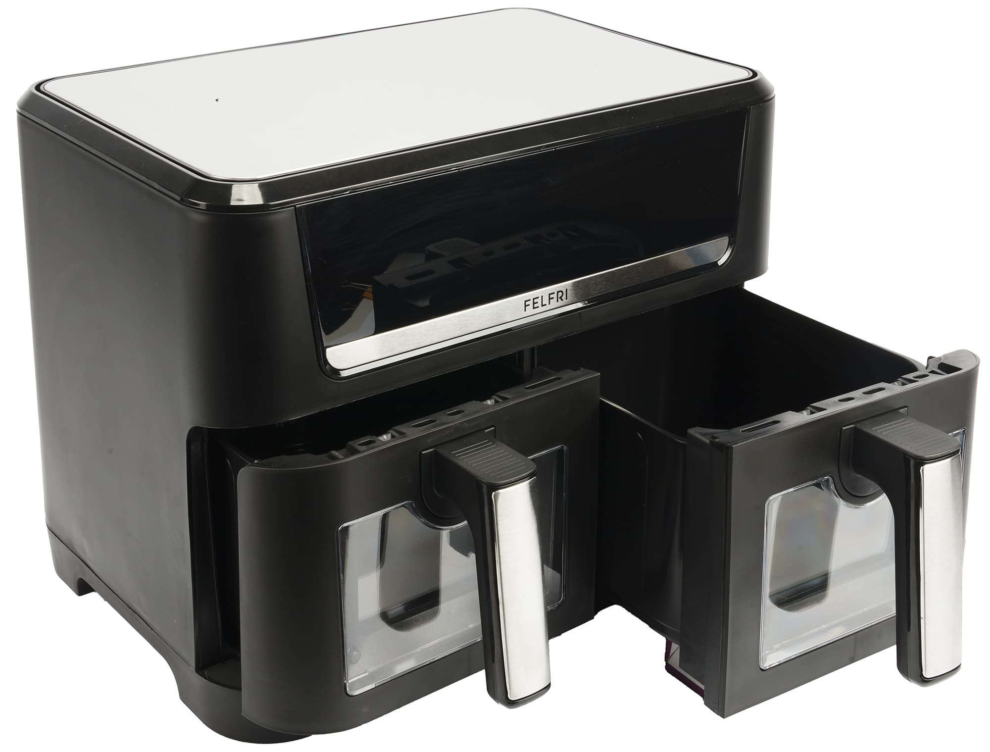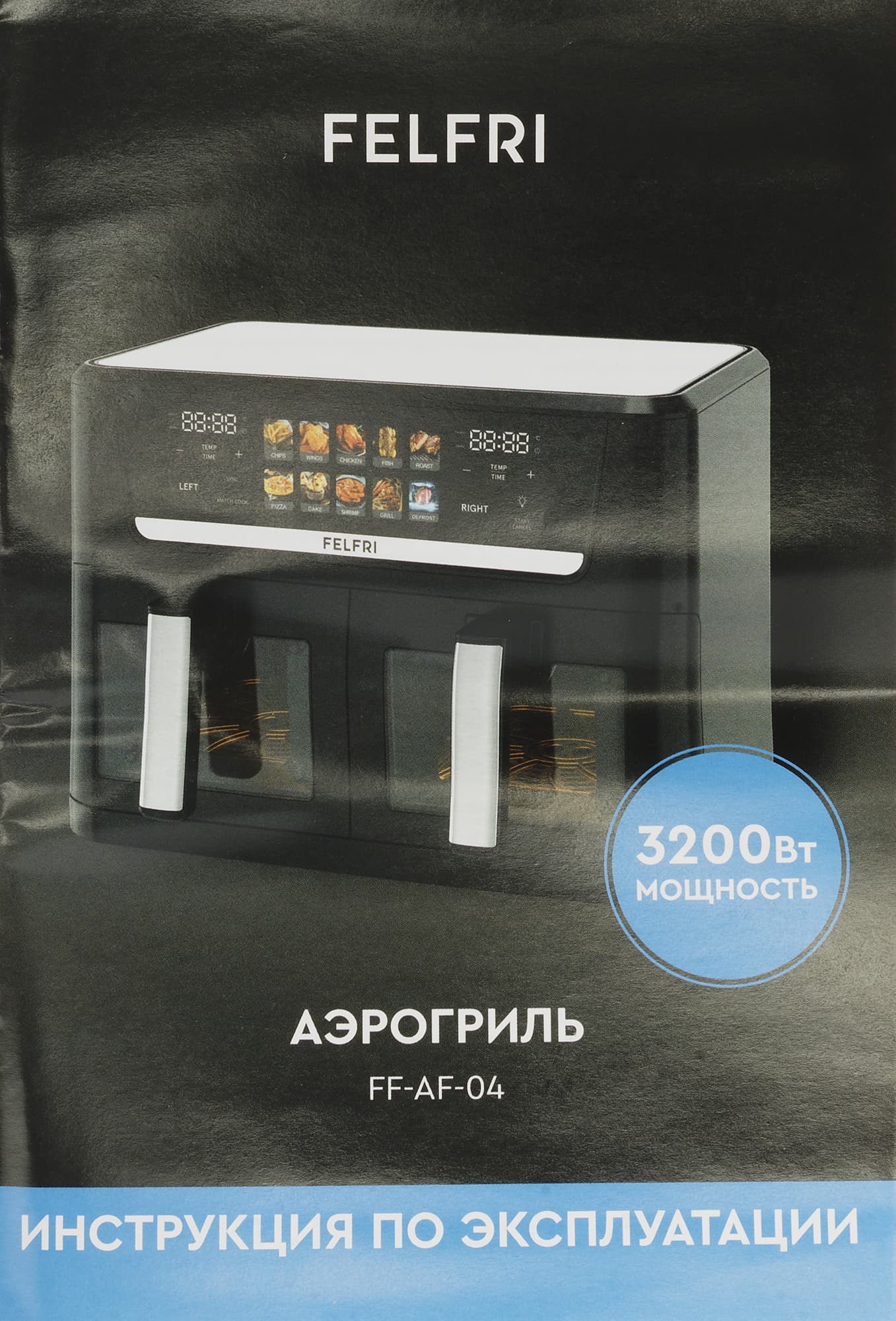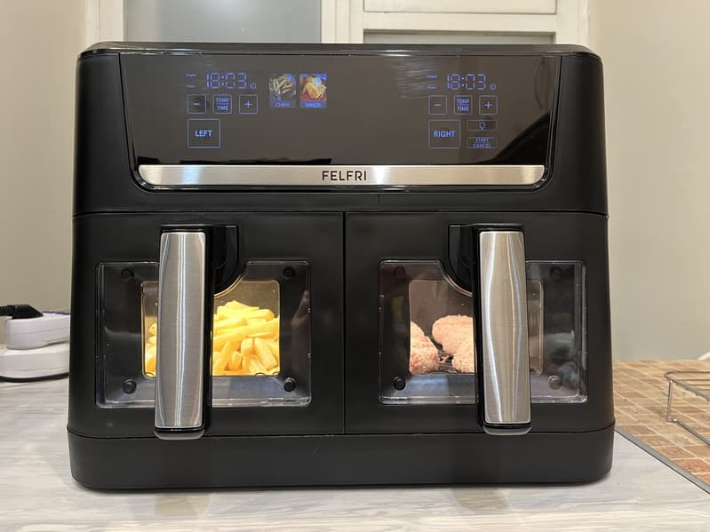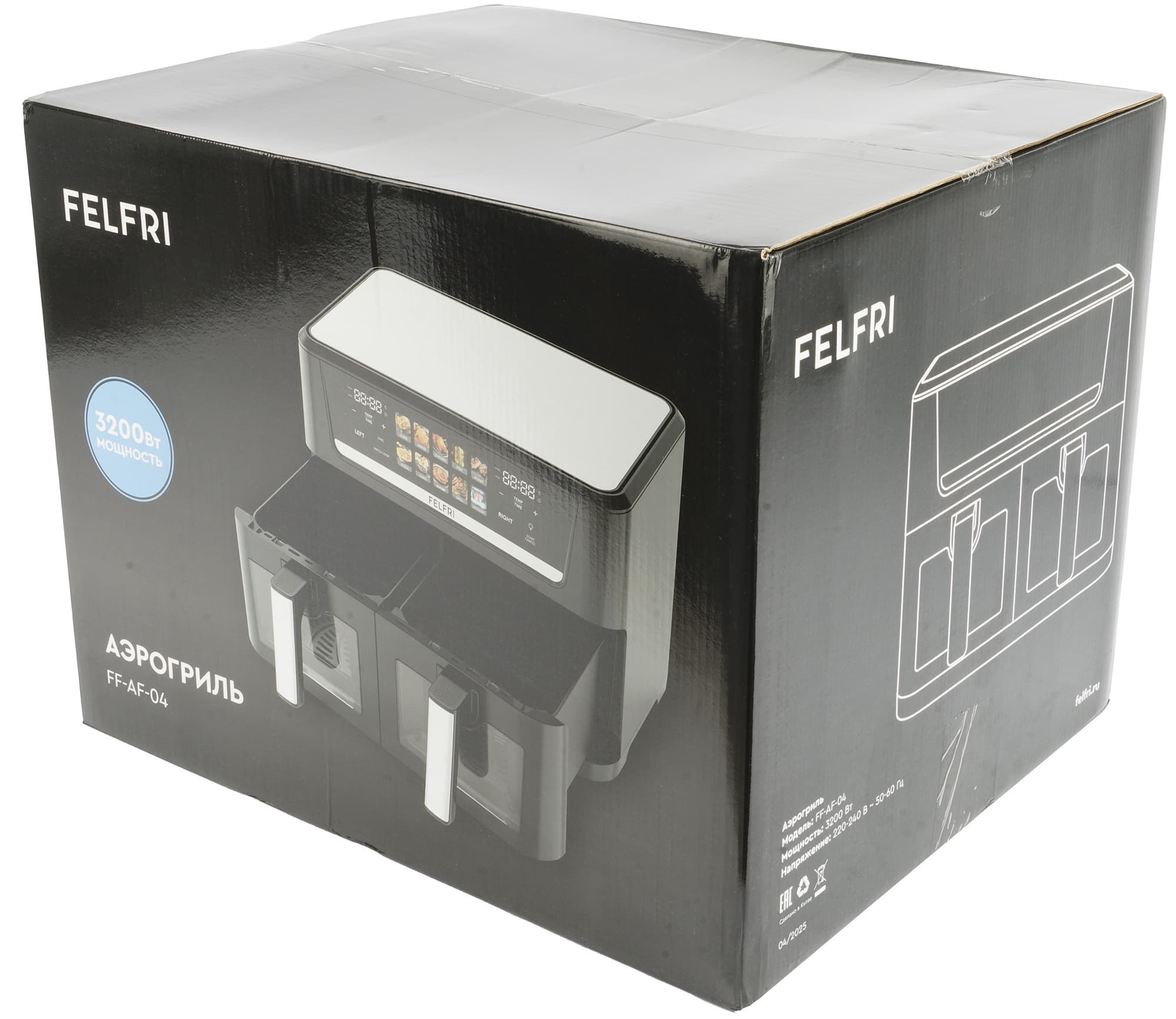 Не так давно мы тестировали аэрогриль Felfri FF-AF-06, теперь же к нам в руки попал Felfri FF-AF-04 — буквально старший брат прежнего прибора. Наш сегодняшний гость отличается в два раза бо́льшим размером, наличием второго лотка для приготовления блюд, высокой мощностью и красочной сенсорной панелью управления.