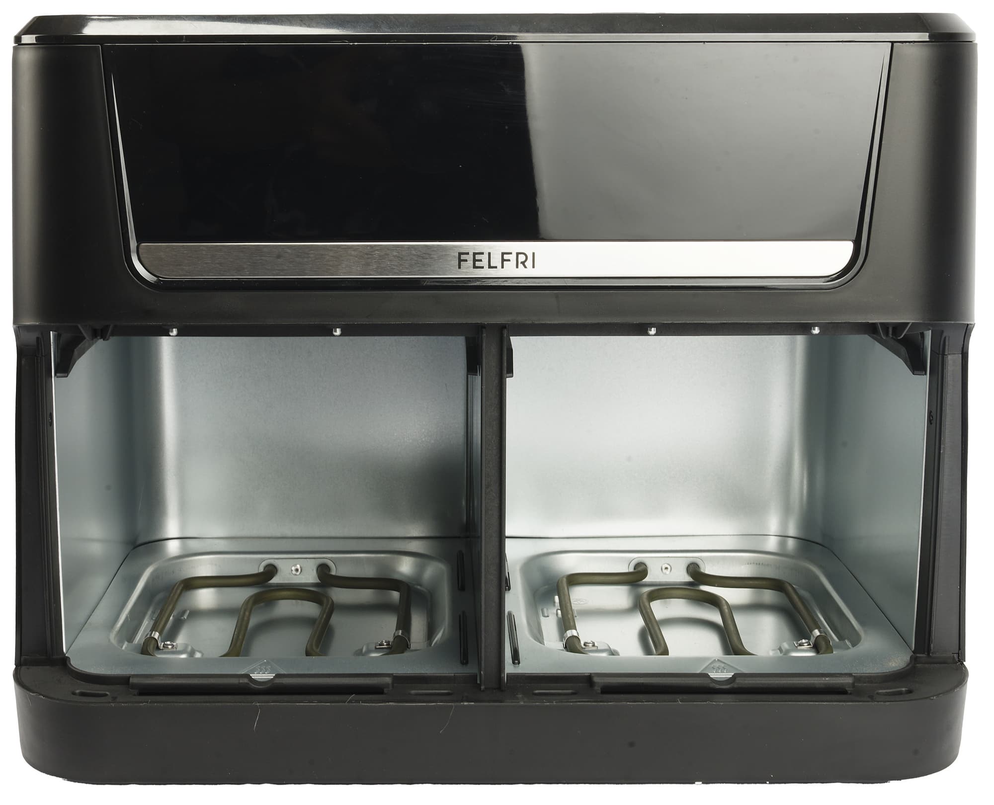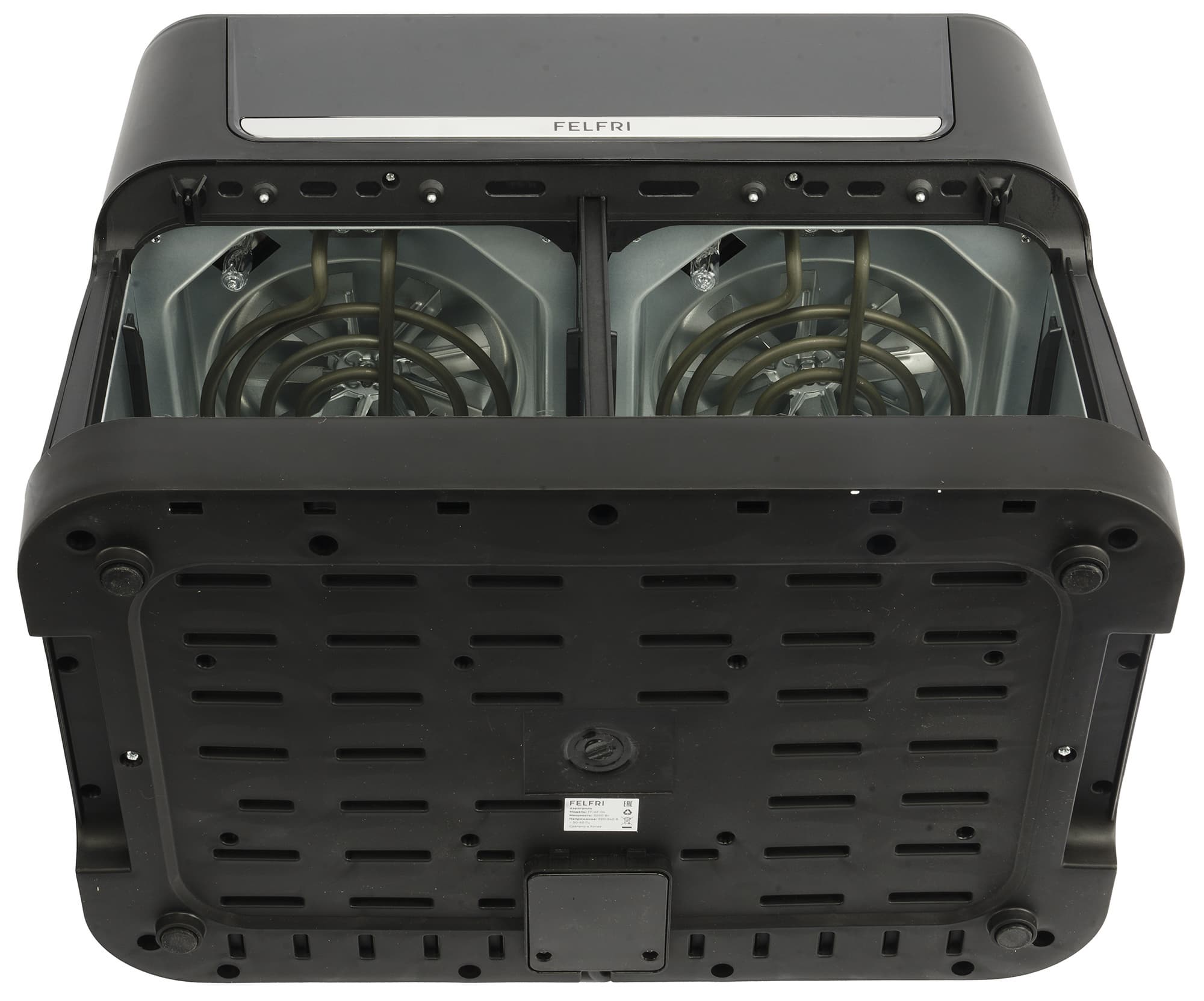Felfri FF-AF-04 — крупный и тяжелый прибор с двумя вместительными чашами, но за счет вытянутого вверх корпуса, на рабочей поверхности занимает вширь примерно столько же места, сколько современная мультиварка или небольшая микроволновка.