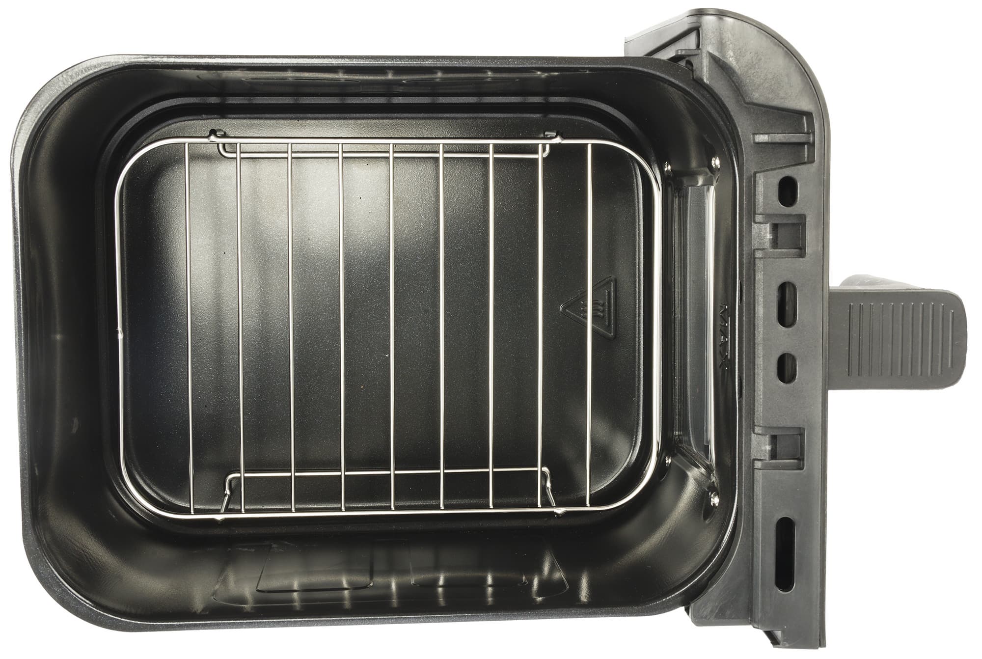 Аэрогриль снабжен двумя крупными ручками — по одной для каждого лотка. Ручки каждой чаши крупные, надежные и удобные — в руке не скользят и покрыты несколькими слоями изолирующего пластика, поэтому не должны нагреваться.