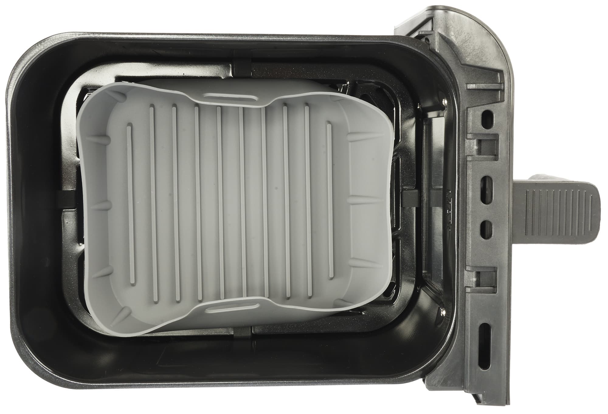 У каждой решетки в центре есть небольшие отверстия, за которые их удобно вынимать из чаш. А по углам закреплены силиконовые прокладки, которые помогают пластинам надежно держаться внутри даже при наклоне лотков, но при этом не царапать их антипригарную поверхность.
