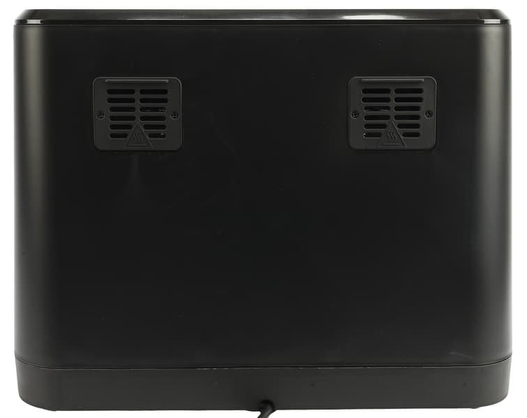 Сзади прибор полностью черный, пластиковый, с двумя вентиляционными решетками и выходом шнура питания снизу.