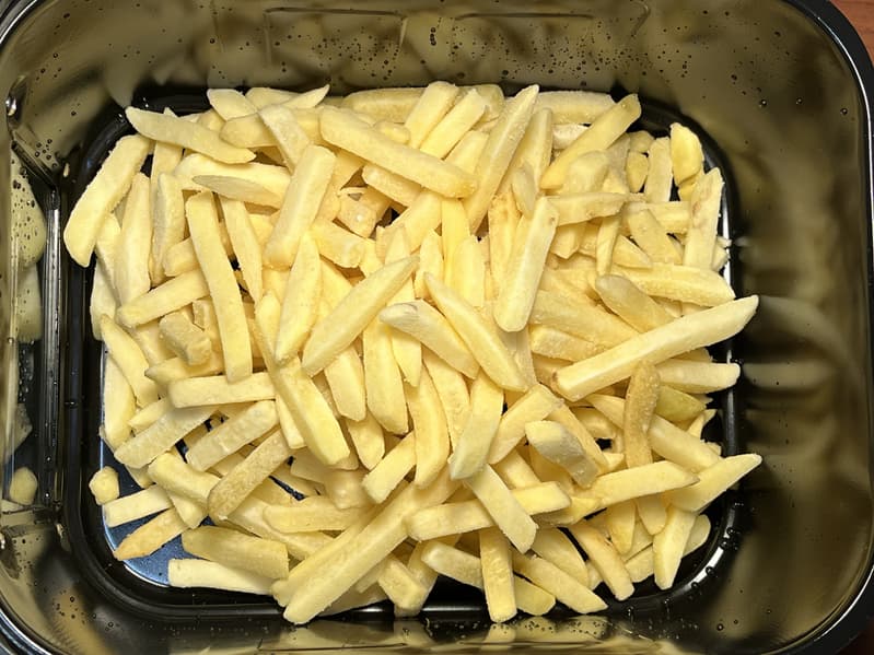 Картофель мы взяли замороженный, с уже добавленным в него маслом. Уложили его в чашу и установили режим «Картофель-фри» с температурой 200 градусов на 20 минут.