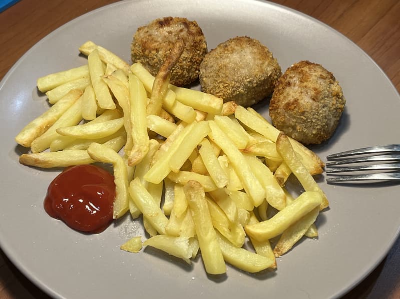 Картофель-фри и куриные котлеты в панировке