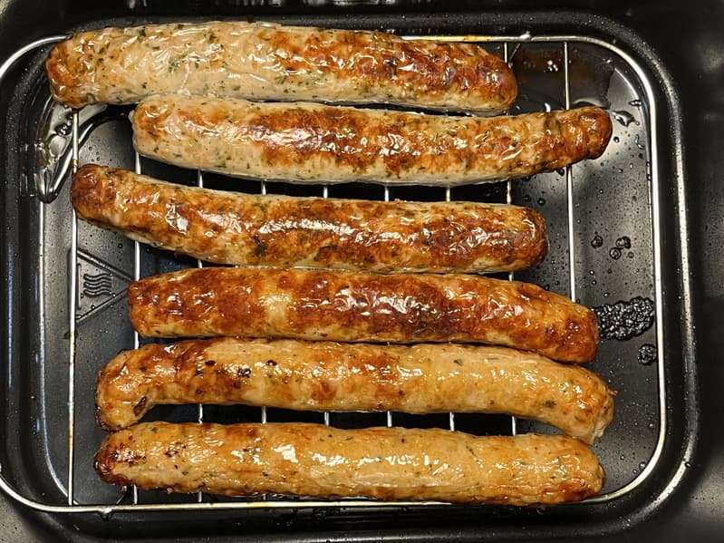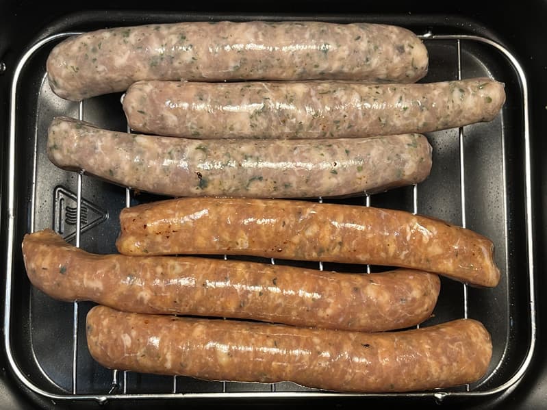 Колбаски, которые так отлично готовятся на открытом огне, но не впечатляют при простой обжарке на сковороде, должны получаться вкусными и сочными в аэрогриле. Поэтому мы решили приготовить и их.