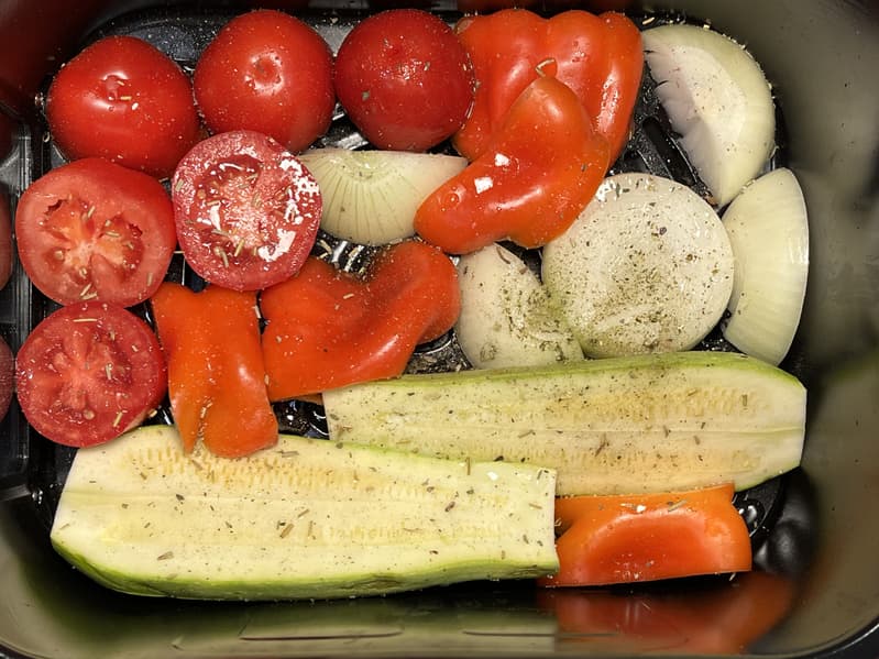 А в соседний лоток поместили овощи — сладкий перец, репчатый лук, томаты и кабачок.