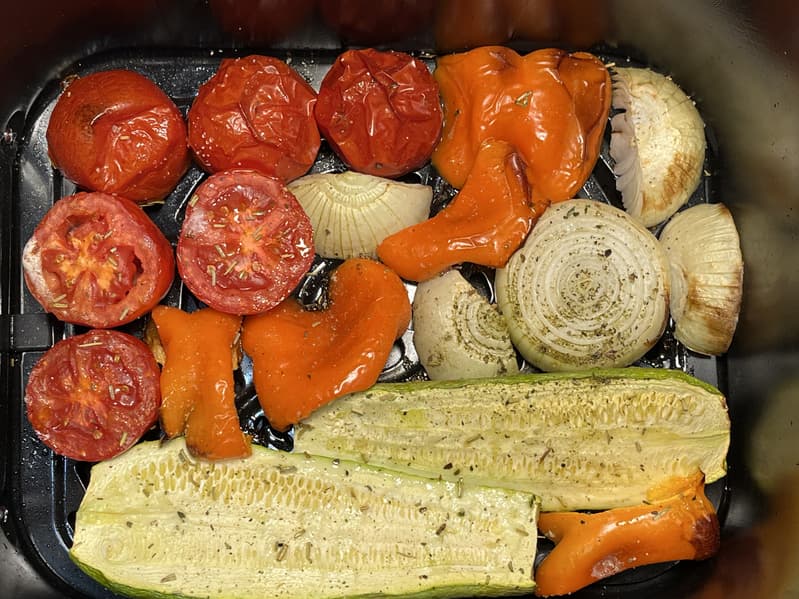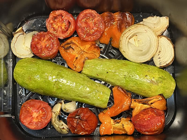 А вот овощам не хватило ни температуры, ни времени, поэтому мы перевернули их и отправили «грилиться» дальше при 200 градусах еще на 10 минут.