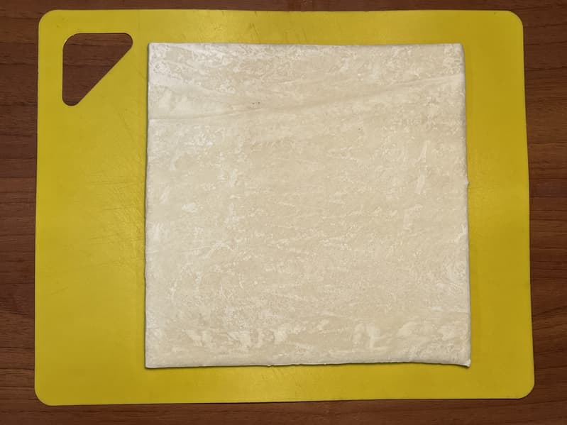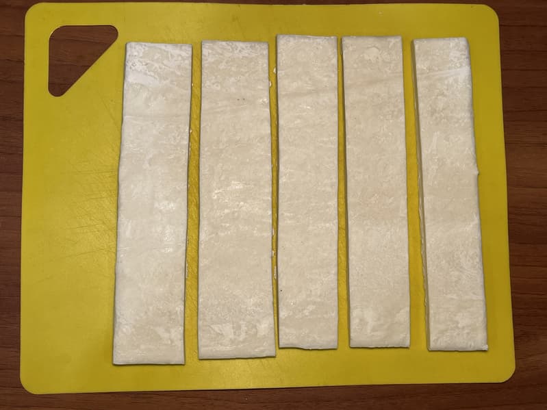 Взяли пласт готового бездрожжевого теста и порезали его вдоль на небольшие полосы.