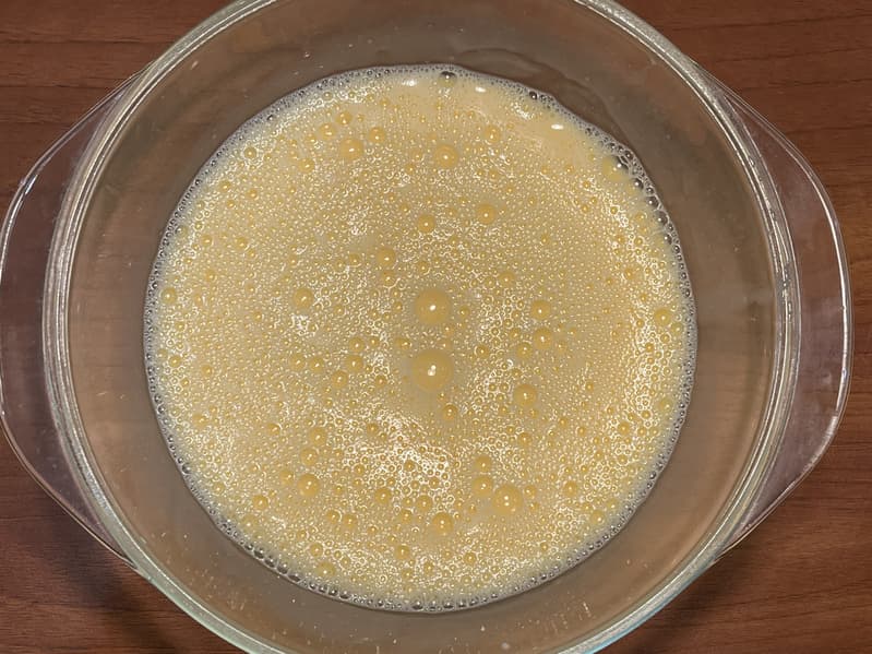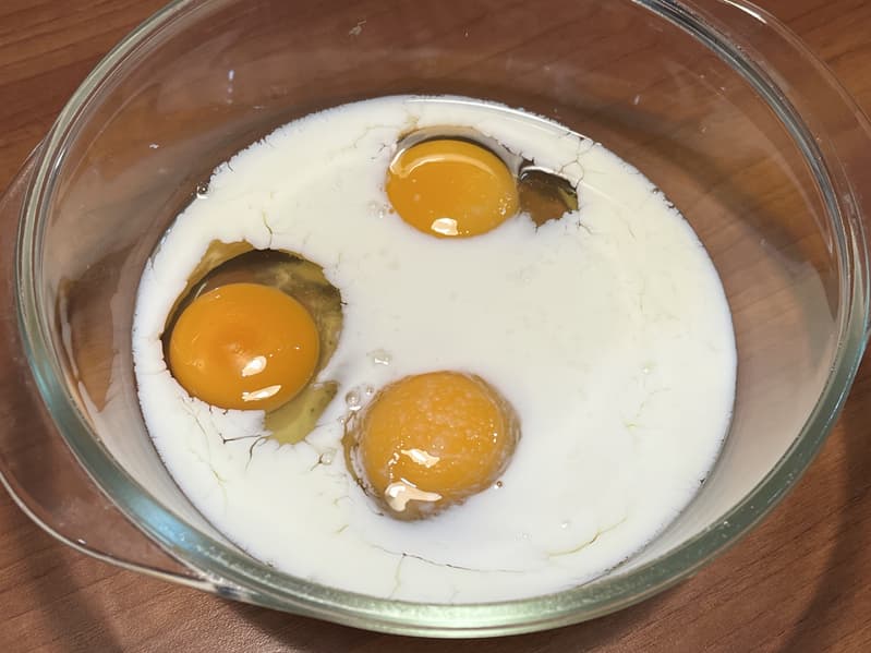 Взяли три яйца, жирное молоко, добавили немного соли и тщательно взбили вилкой.
